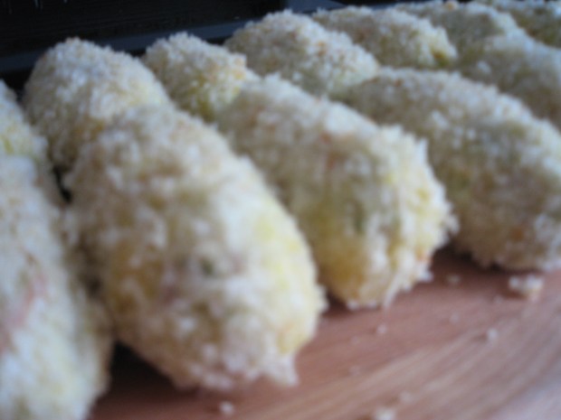 Now that I am looking more thoughtfully at traditional cooking, I see the push and pull between old and new everywhere. I like of the thought of these two restaurants sharing a kitchen, side by side like a whim of Gaudí.  I decided to try to make Marisa’s Chicken and Serrano Ham Croquetas, served at both restaurants.  I included a picture above of the uncooked breaded croquetas because they were much prettier before I inflicted my skittish frying on them, as seen below.Croquetas de Pollo y Jamón Serrano/Chicken and Serrano Ham Croquettes