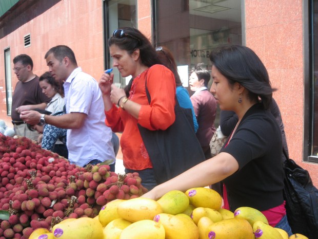 Steven, Hayley, Benjie, Annette and Raqui check out a fruit stand on Mulberry Street.