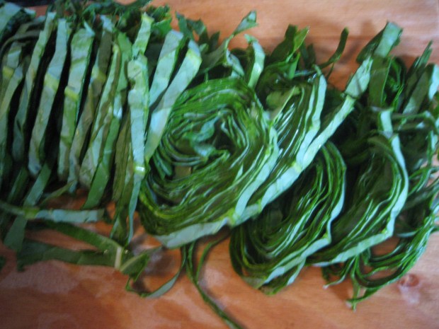 Rinse the collard greens or couve, then stack the leaves on top of each other, roll into a bundle, and chop into a chiffonade.
