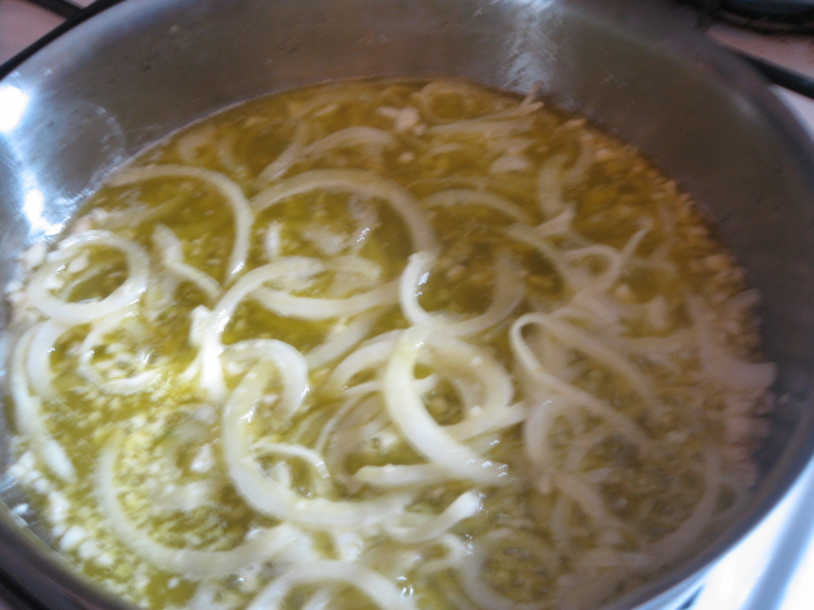To make a sofrito, sautée half of a large, thinly sliced onion with minced garlic, and a few pieces of the kielbasa, taken from the simmering beans, in a generous amount of olive oil over medium heat. Cook until the onions are translucent and the garlic is golden.