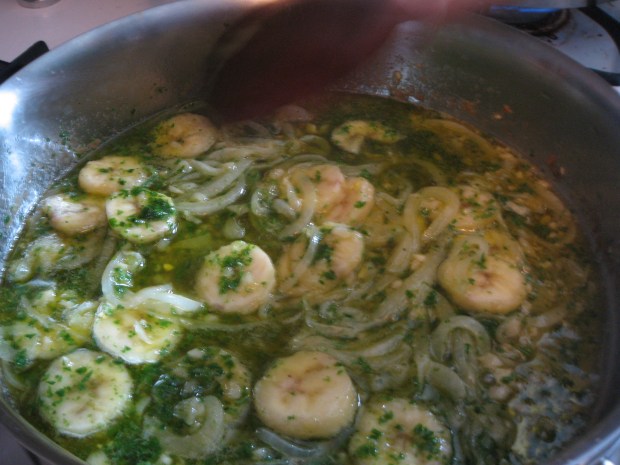 Add one banana, sliced in 1/2-inch pieces and a 1/4 cup of roughly chopped parsley to the sofrito. Cook until the bananas have softened slightly, about 2-3 minutes.