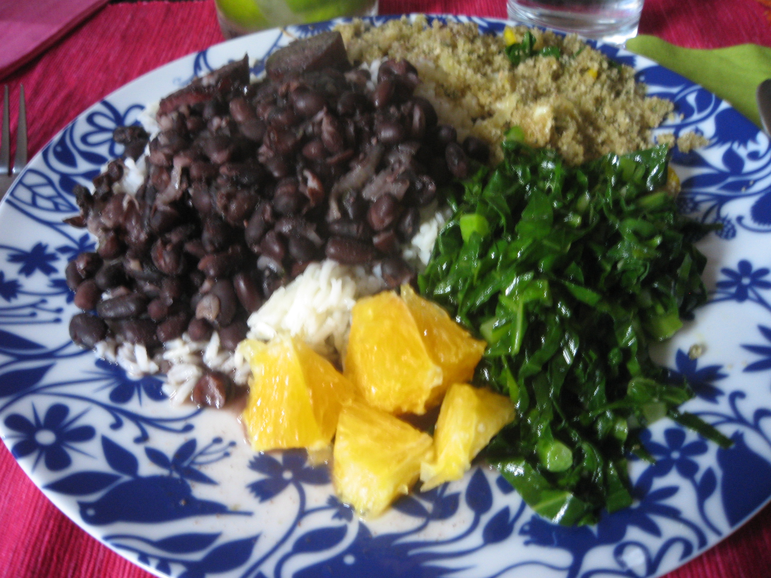 It was during one of my visits that she tried to explain how to make farofa, a dish I had been reading about and wanted to try. Claudia can’t not help someone, so she agreed to come to my apartment and show me herself. In addition to the farofa, the menu grew to include: feijoada, a black bean stew with pork (using kielbasa as a substitute for Portuguese linguiça); couve, collard greens sauteed in olive oil and garlic; fluffy white rice cooked with more garlic; sliced oranges; and, of course caipirinhas.