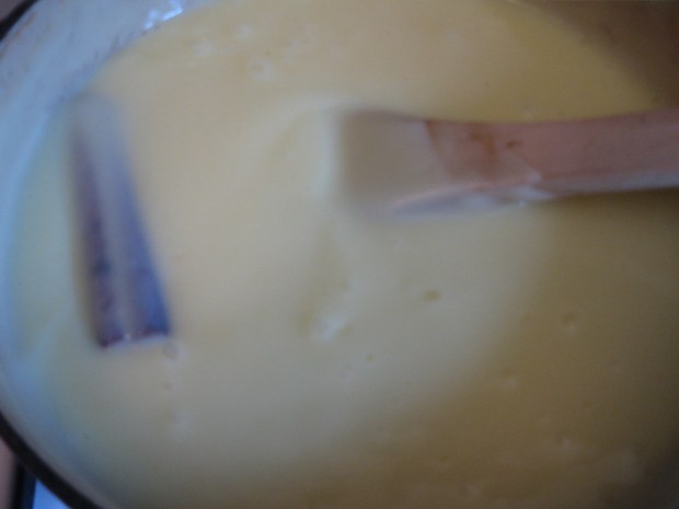 Using and electric or hand mixer, beat the egg yolks on medium, gradually adding the sugar until they’re pale yellow and form a ribbon. Whisk in the dissolved cornstarch to the egg mixture. Whisk in one cup of the cooled milk. Add the rest of the cooled milk. Return egg and milk mixture to saucepan. Cook over medium-low heat, stirring constantly until it thickens, about 13-15 minutes.