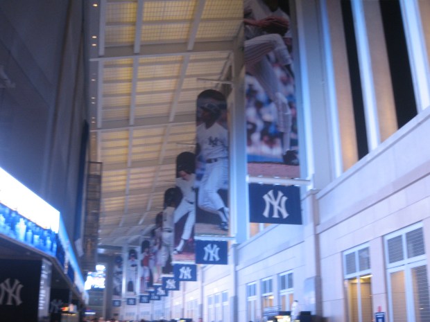 With family visiting, I finally attended a game in their new home last night. Walking into the the Great Hall, with its enormous banners of Yankee greats and rows of ticket takers that were still can-you-believe-it ecstatic, you understood why people used to attend games in a suit and tie. Everywhere you looked the gods were at play-laughing, celebrating and of course eating.