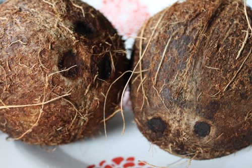 2. Coconuts have three little black eyes on one the top that should be dry and free of mold. The holes can be punctured with a corkscrew then drained. When punctured, the coconut made the same “ahhhhhh” sound as a can of soda.