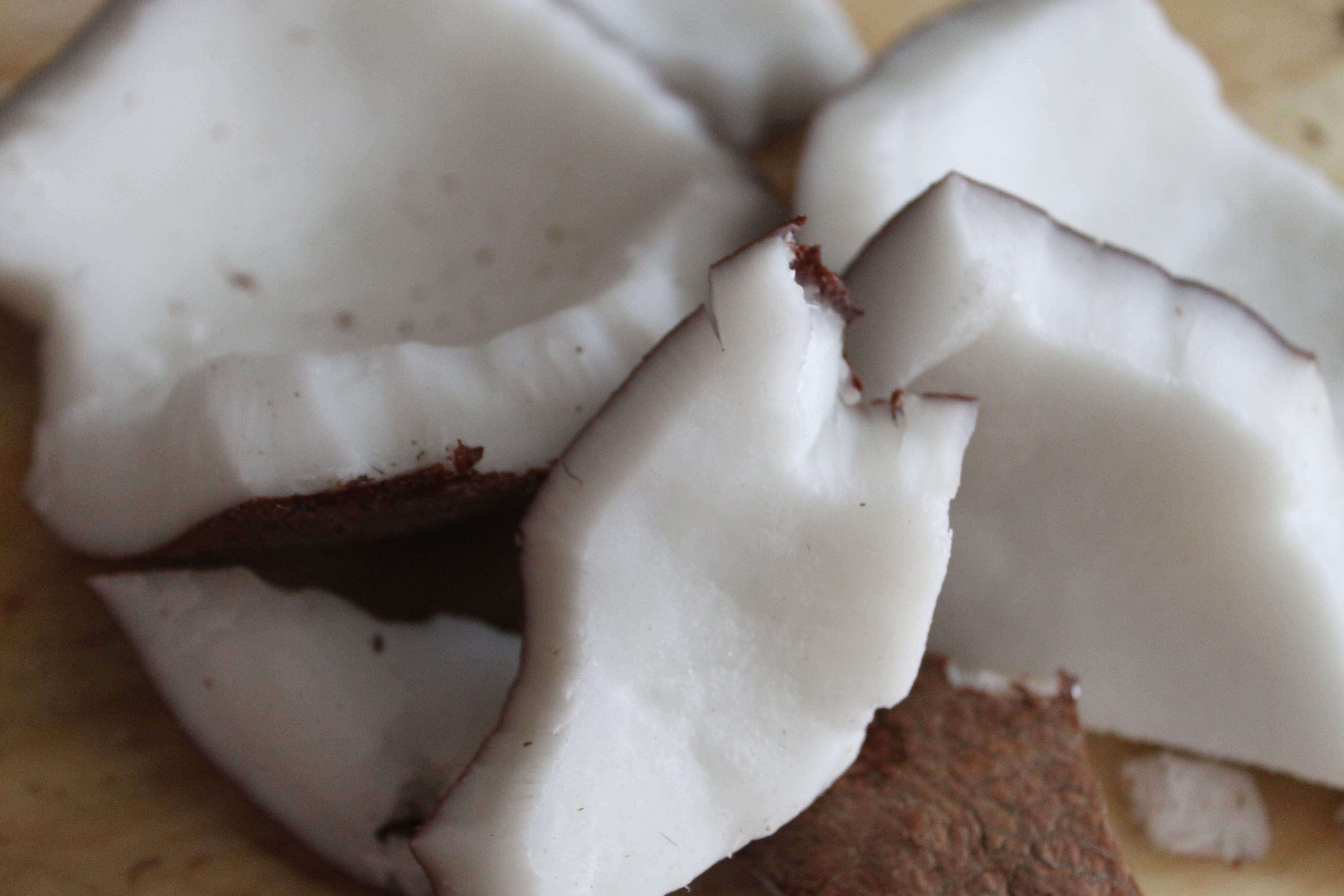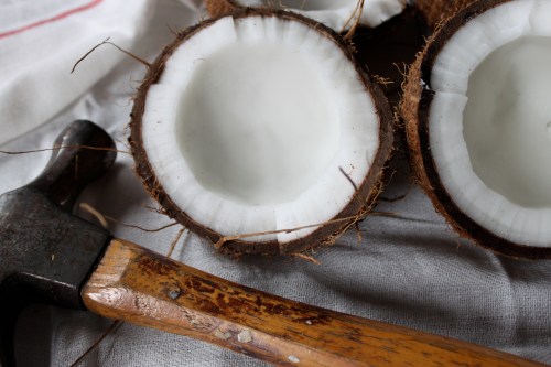 3. To crack open the drained coconut, a few hard taps of with the blunt side of a heavy knife where the coconut is widest may be more ladylike, but a hammer works faster. I had beginner’s luck with my first coconut. After a few taps, I saw a perfectly straight fissure open up along its center. The next three didn’t budge. After a quick Howcast check, I heated the other three in an oven at 400 degrees for 10 minutes. Once cooled, they opened easily with a few hammer taps. Though most sites advice using a sharp knife, I used a strong butter knife, that didn’t bend, to pry the meat away from the shell in larger pieces, making it easier to peel the skin away afterward.