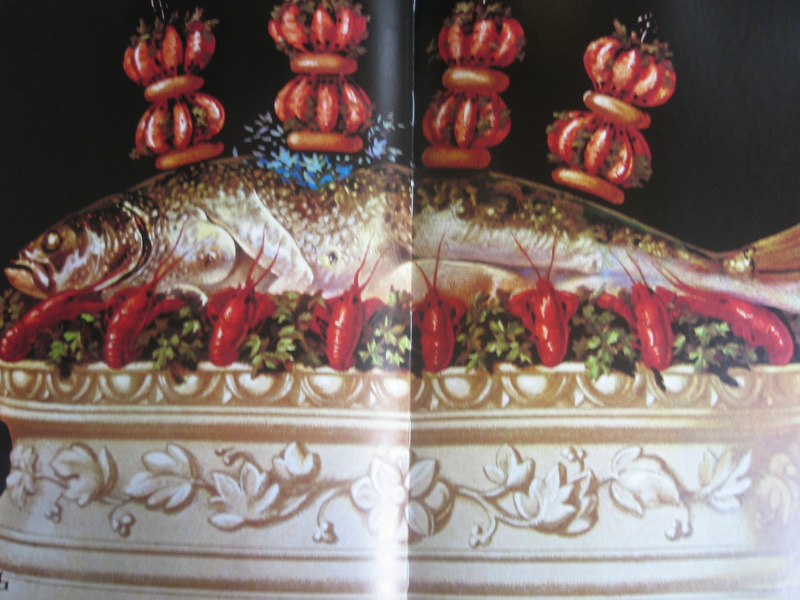 I remembered an art history professor I had in Spain. As a student, she recalled seeing Dalí at the Prado, standing in front of El Bosco’s El jardín de las Delicias for hours a time. This activity must have made him hungry because he begins every chapter – which focus on everything from meats to frogs to game to desserts – with illustrations from the famous work and quotes from Rabelais. The chapter titles were a meal in themselves with names like “les cannibalismes de l’automne” (eggs-seafood), ‘les “je mange Gala”‘ (aphrodisiacs), “les montres molles demi sommeil” (pork), and “les delices petits martyrs” (hors-d’oeuvre). The directions lived up to the titles. So few cookbooks these days call for castrating fish (Peruvian Crayfish), throwing cakes into boiling oil (Mexican Baby Turkeys) or for dishes that are “elephantastic.” One recipe for a Casanova cocktail – a mixture of orange, bitters, ginger, brandy and Cayenne pepper- directs you to “drink…and wait for the effect. It is rather speedy.” Leaving me to wonder exactly what is supposed to happen?