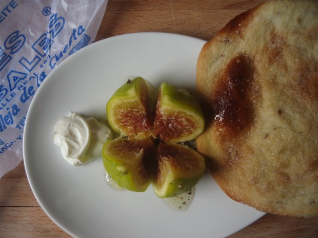 A friend coined the term produce shopaholic on her blog, Mindy’s Recipe for Disaster. If I’d read her post earlier, I may have recognized the symptoms before I went on a why-not-bender at the Park Slope Food Co-op yesterday. Though I love figs, I rarely buy fresh ones. I have plans for tarts and compotes, but the slightest delay and they’re past all use. Still, I couldn’t resist when I found organic Calimyrna figs. I reasoned that the green ones would at least give me a head start, and they were so cute and plump I had to take them home. A quick search online and through my books gave me a couple of ideas. I had some this morning drizzled with peppered honey and Spanish goat cheese with sweet olive oil crackers. It was sweet, spicy, flowery and creamy all at the same time. The recipe from Bon Appétit could not be easier, so there is no reason to put off using them straight away. I also found an interesting recipe for fig compote with red wine and spices among the formidable 1080 Recipes, one of my favorite cookbooks/step stools that I’ll try next. Now that I’m hooked, I’ll need more figs.