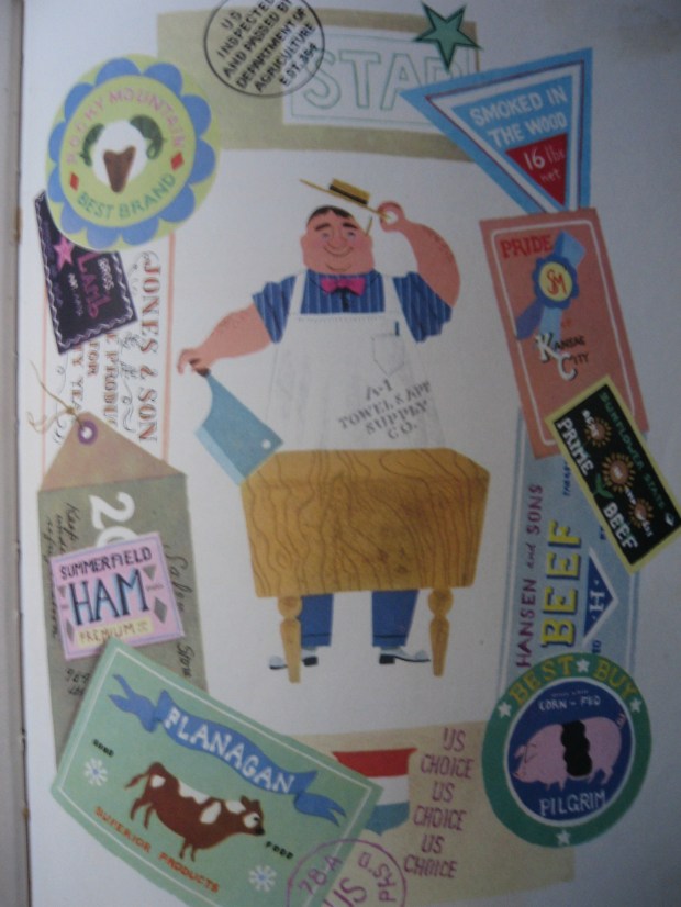 Some books seem more alive than others. I found this 1949 copy of James Beard’s The Fireside Cook Book today in a used book store. Banged up and worn through, it was love at first sight. Opening with description of prehistoric man enjoying a salad, he then compares the caveman’s roasting of a saber-tooth tiger to the modern housewife making Sunday dinner. The illustrations by Alice and Martin Provensen – turtle troubadours, snatches of music, lobsters taking swigs from wine bottles, foxes teaching hen school, devils and angels – keep pace with the text. I’ll have to read it cover to cover to find out why those clams in booties are attacking that chicken with pitchforks. While his love of the old world is evident, his Whitman-like enthusiasm for new world American pulses throughout. Everything about this book makes you smile.