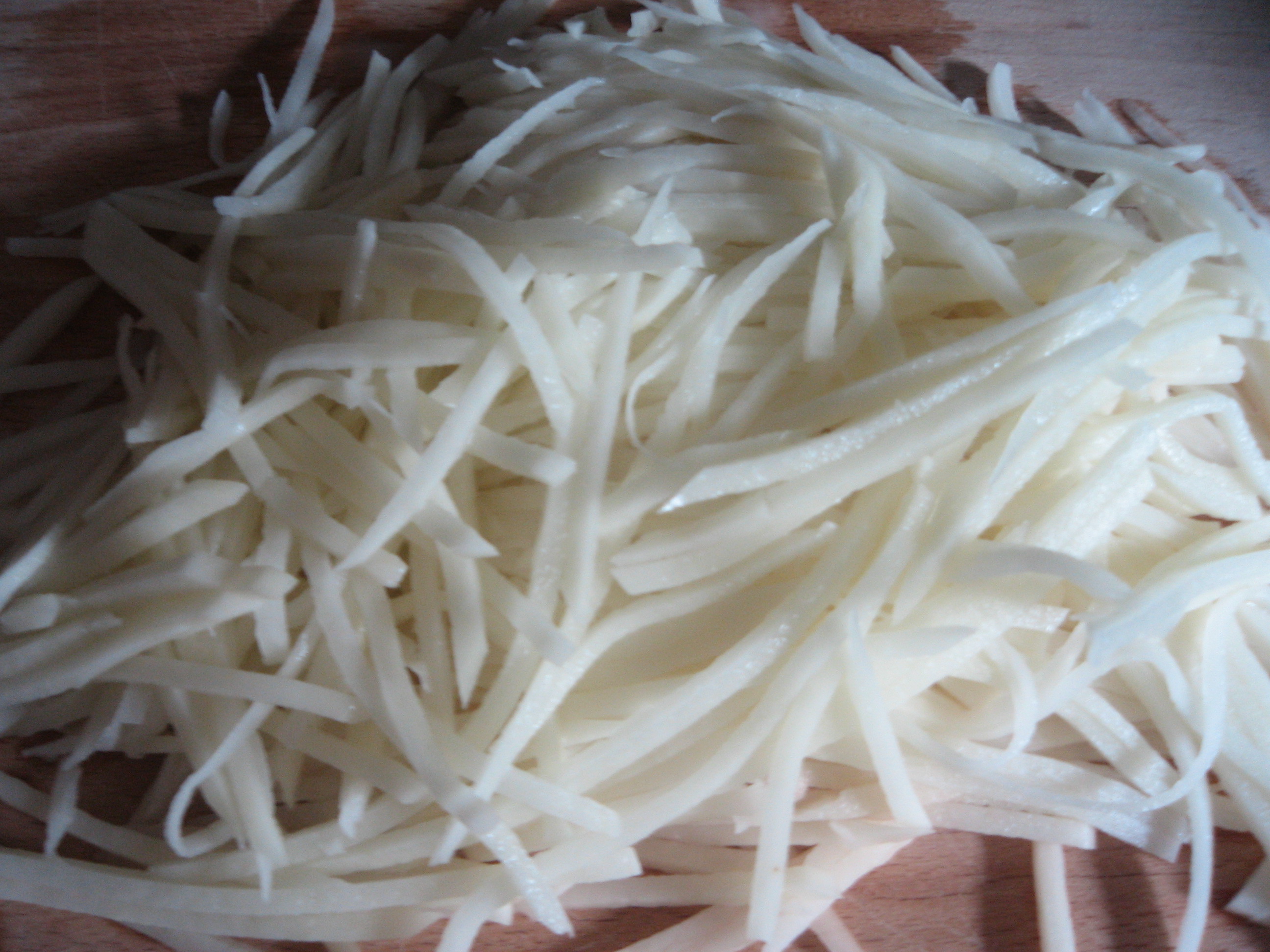 Using a mandoline or other vegetable slicer, cut potatoes into strips about 1/8″ thick.  Soak potatoes in cold, salted water to cover for about 30 minutes.  Drain and dry well.