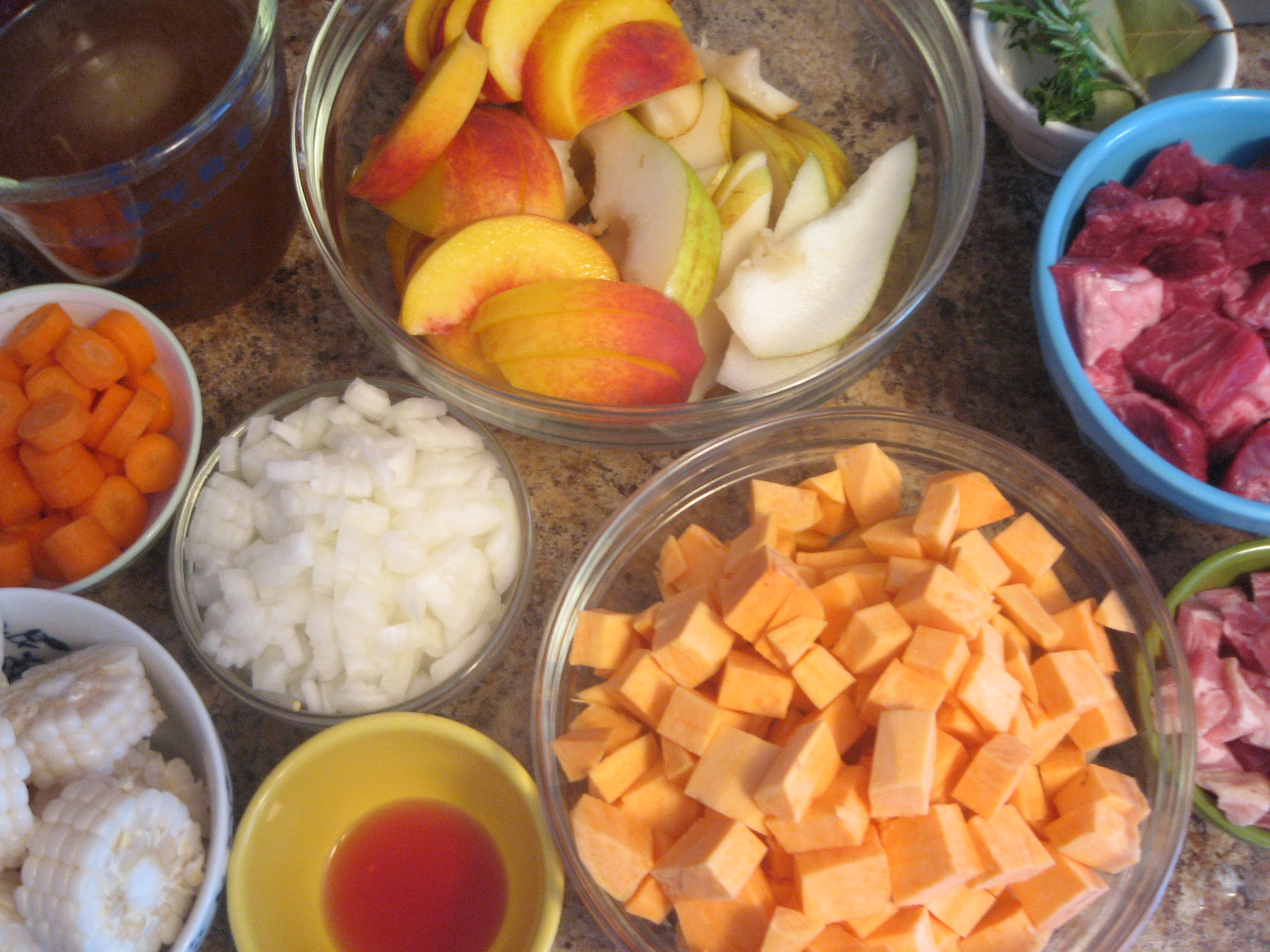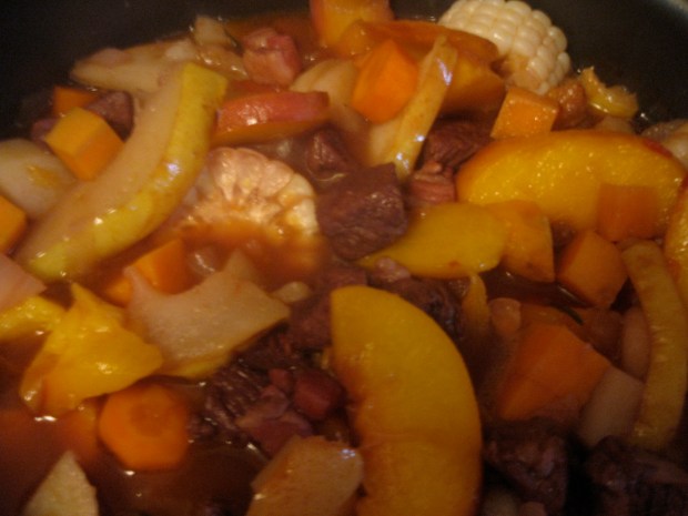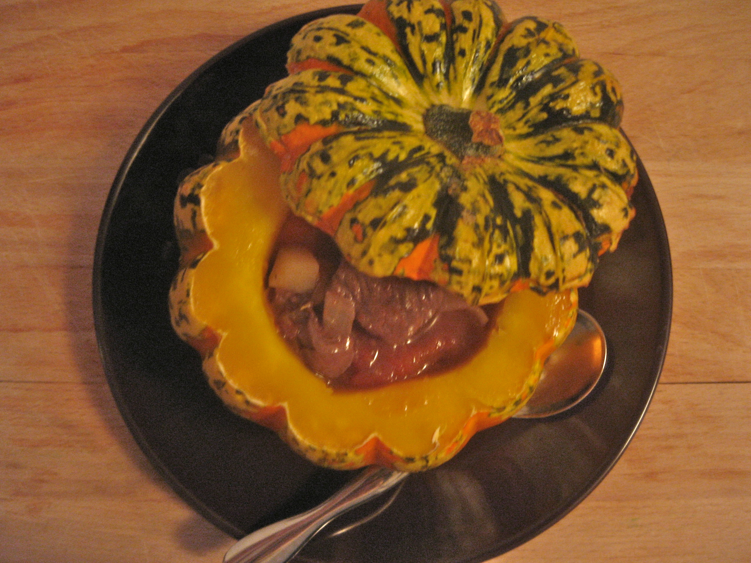 Buried in a cookbook from the 1960s, I first read about the Argentinian carbonada earlier this summer. Made to celebrate Argentinian Independence Day on July 9, during their winter season, stew weather seemed a long way off then. A mixture of beef, corn, peaches and pears, it seemed perfect for early fall, when the heartier fruits and vegetables come in just as the sweeter fruits of summer are fading out. Wishing I’d taken pictures of the market’s golds, purples, and reds, I felt like bit of a witch at her cauldron when they reappeared in the pot. Traditionally, the carbonada is served in a large pumpkin-like gourd called a zapallo. Hollowed out, baked, then filled with the stew, each serving includes a spoonful of pumpkin. With no fairy godmother to turn my northeastern squash into an Andean zapallo, I turned the small acorn and colorful delicata squashes into soup bowls instead.