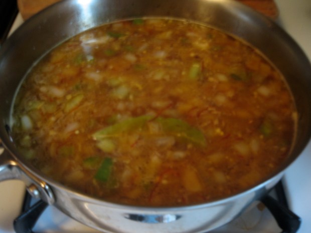 In the same pan, sauté the onion and peppers until soft, about 3 minutes.  Add minced garlic and 1 teaspoon of salt and continue to cook, about 2 minutes.  Add the reserved marinade, wine with saffron, chicken broth, tomato sauce, and bay leaf.  Bring to a boil  Add chicken pieces and simmer, covered for 10 minutes over low heat.