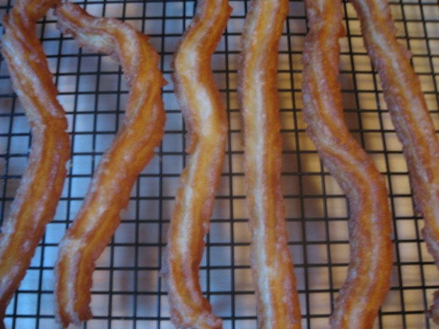 Line baking sheet with parchment paper or non-stick liner. Fill the canister of the churrera or pastry bag fitted with large star tip. Form strips directly on baking sheet about 1″ thick and 5-6″ long. Carefully add strips to oil 5-6 pieces at a time and fry till golden, turning occasionally, about 3-4 minutes.