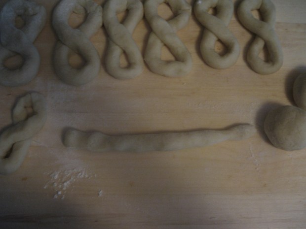 Cut dough into pieces. Form 1 piece of dough into a 1/2-inch-thick rope on a lightly floured surface and shape into a figure 8.