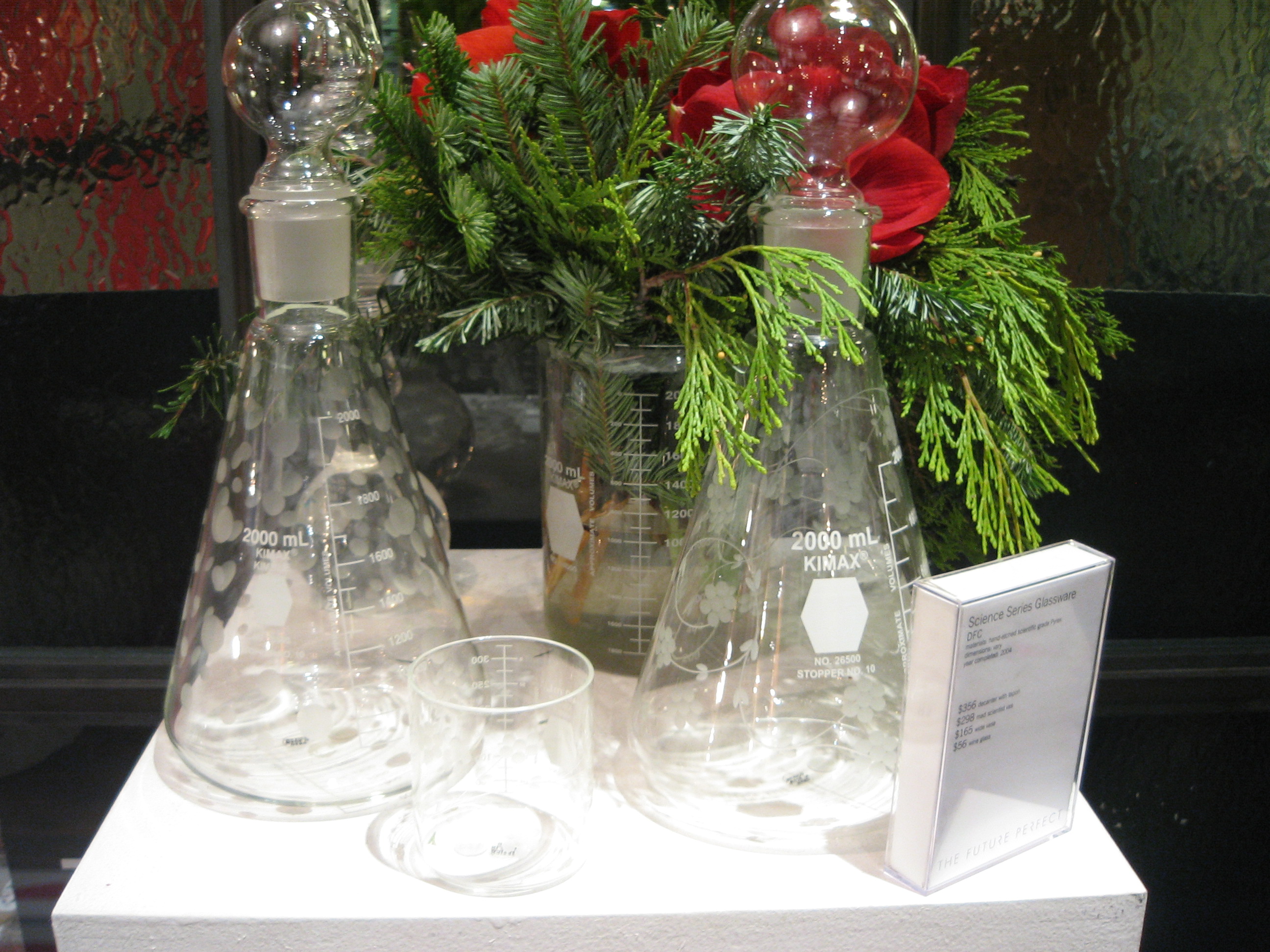 pop-up store. Fortunately, they put it where I would definitely find it, directly behind the Jacques Torres. While it’s only a small selection from their store, the items seem to vibrate as though emitting seussian brain waves. It’s easy to see why a perfect future might include Jason Miller’s Seconds dinner and desert plates ($90-$132, set of 4), Science Series glassware ($56-356), and a maison serving dish from Access Paris designed by P. Martinez ($45).
