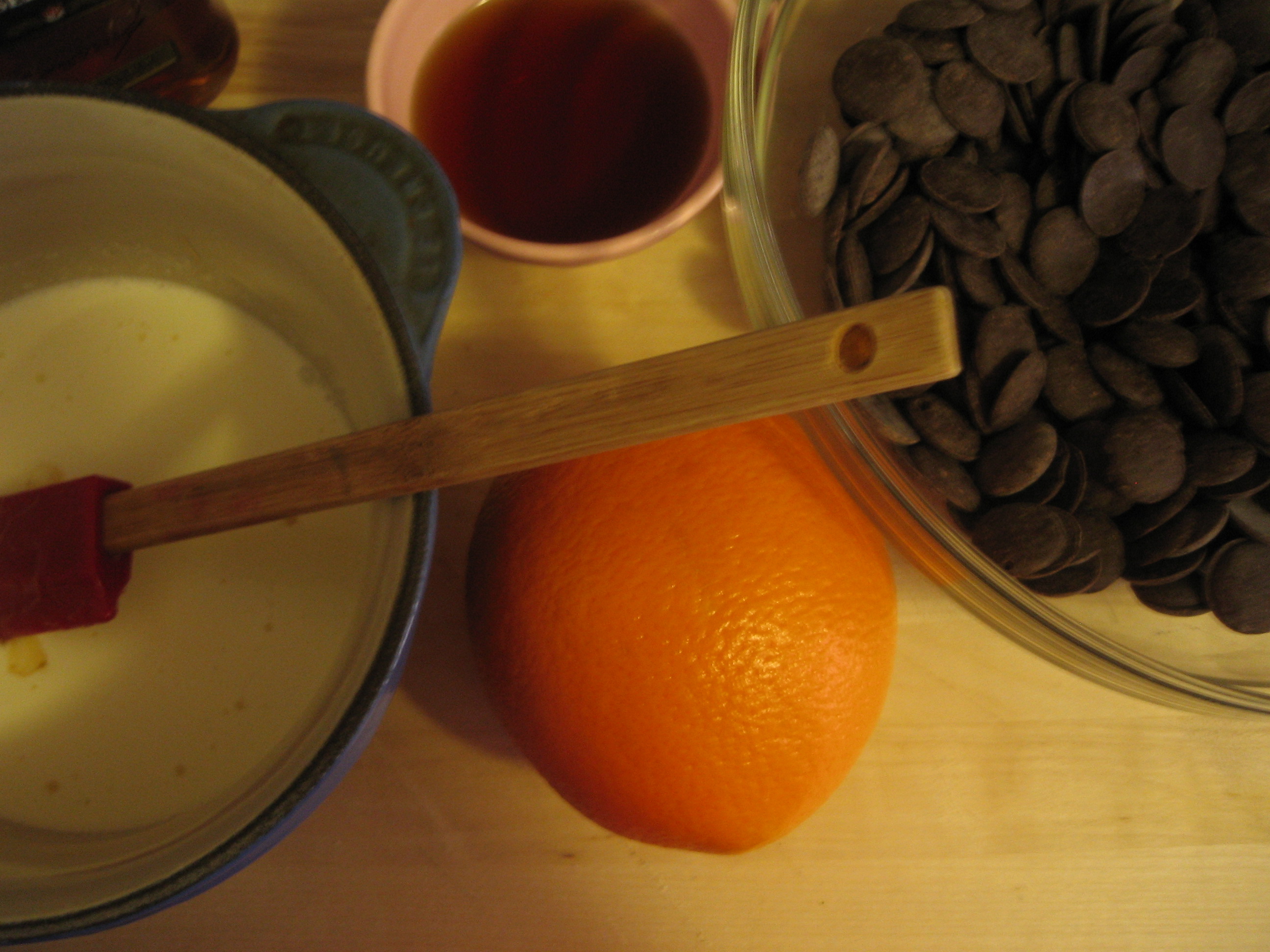 I needed a gift for a friend who loves truffles so I decided to make a batch infused with orange syrup and rum. Having attended a truffle demonstration by Kir Rodriguez, a former monk and self-described current agnostic in love with food, I followed his recipe. As I started working, my mind wandered. Having already set up a small chocolate factory in my kitchen, why not knock out a few extra batches for my brunch friends the next day or for the person who’s coming to hang my shelves next week? Unfortunately, while I imagined gifting the neighborhood with prissily packaged homemade truffles, the orange syrup got gloopy, the cream boiled over and I took a small rum bath when I was trying to adjust the measurements. The chocolate and cream did not emulsify beautifully as described, or even girlfriend cute. Anxious to see if any of it was salvageable, I refrigerated my bowl of chocolate puree to see how it would set. It was edible, but not giftable.