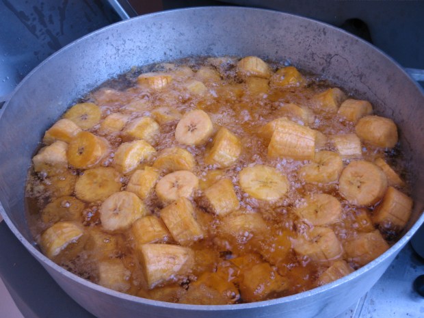 Cut the ends off the plantains and slice down the middle.  Remove the peel and cut into 1″ chunks.  Heat one cup of corn oil in a deep frying pan until hot.  Add plantains in batches and fry until golden all around, about 3-5 minutes.