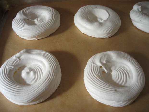 Fill a pastry bag fitted with a star tip with the meringue. Pipe a disc of meringue to fill each circle on the prepared sheet then an a additional layer along outer circle to form a border.