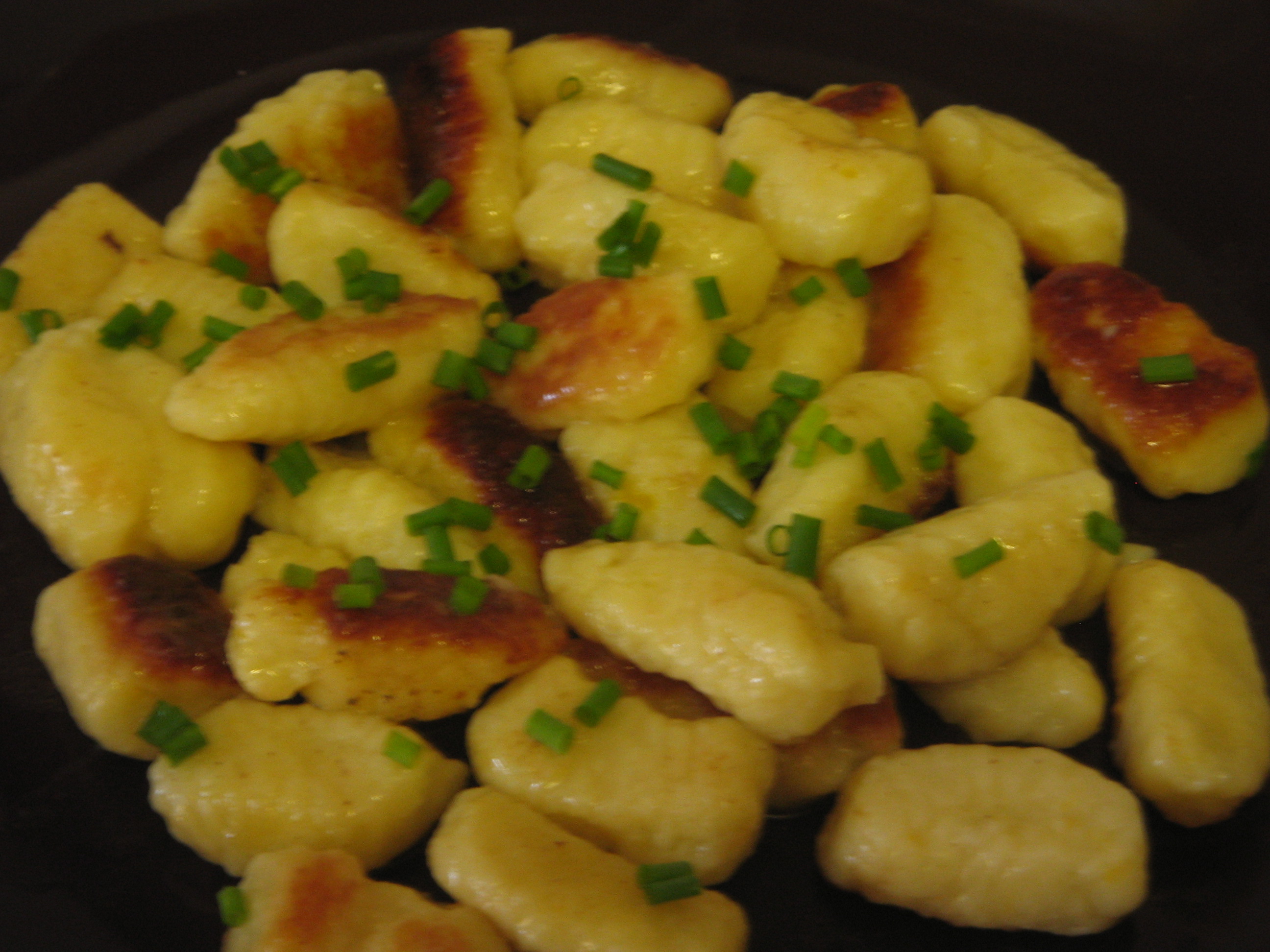 Warm butter sauce over low heat.  Pour over gnocchis and gently mix until evenly coated.  Transfer to serving dish and garnish with chopped chives to taste.
