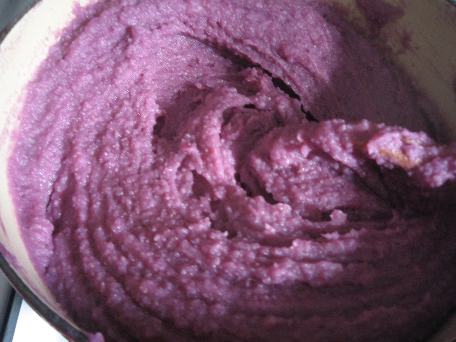 Add the ube powder. Whisk well. Whisk in the ube puree, lower the heat. Switch to a wooden spoon. Stir constantly until the mixture starts to pull away from the sides of the pan. Reserve.