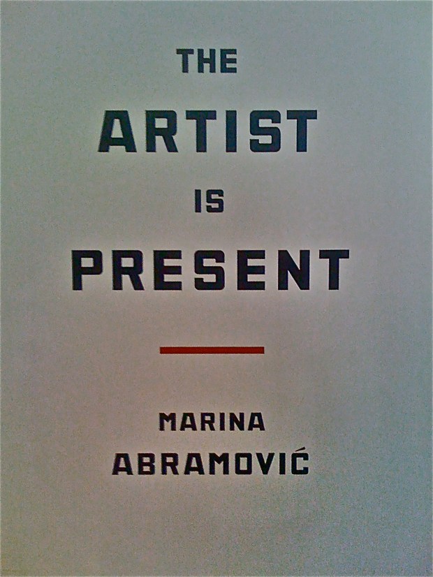 Inspired by Tania and anxious to see more, I went to a members preview of Marina Abramovic: The Artist Is Present opening at tomorrow at MoMA and running until May 31. Aptly named, she will be present and sitting in the museum’s atrium for 716 hours and thirty minutes at a table with an empty chair. Visitors are invited to wait in line to sit across from her for any length of time. In the galleries, actors trained by the artist recreate her most famous pieces while small screens play video footage of the original works. While many focused on her ability to endure, I was more impressed her perfect concentration and well…presence in everything she did. I couldn’t help but think of all the devices – books, magazine, iPhones, iPods – I use to make me feel that I’m not where I am – on a run, on the subway, in waiting rooms. A parallel universe I keep charged and with me at all times. Of course, that didn’t stop me from using iPhone to take this picture: