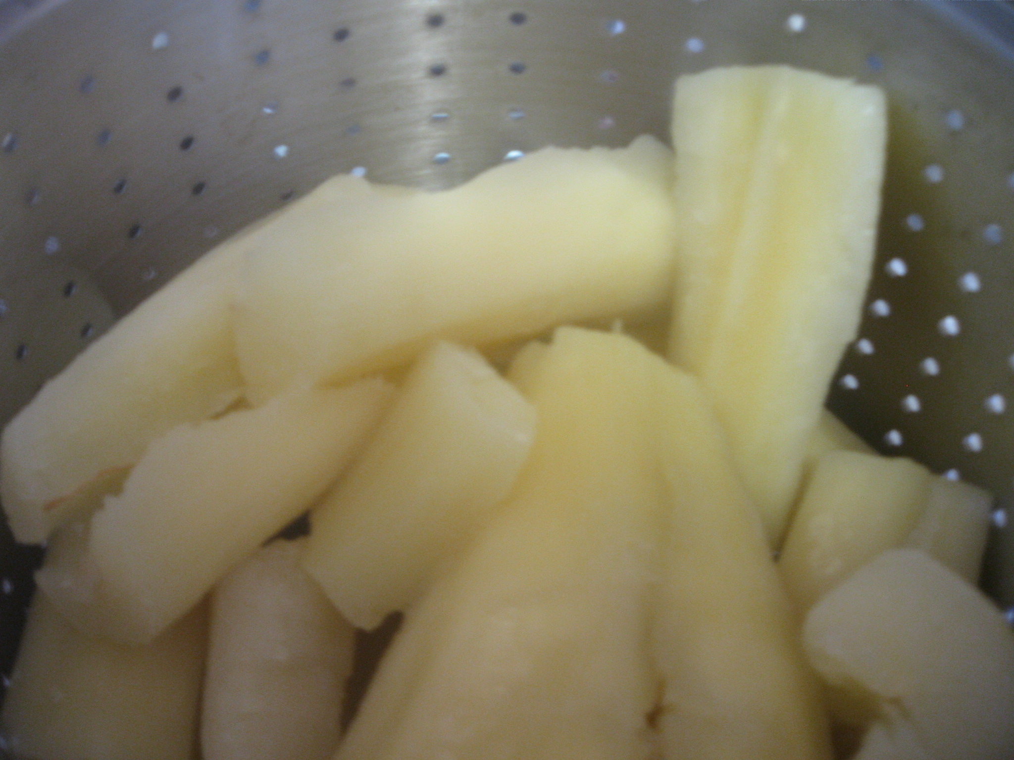 *If you are using a potato masher, remove the stringy fibers from the core of the yuca before mashing.