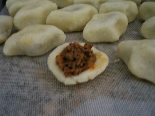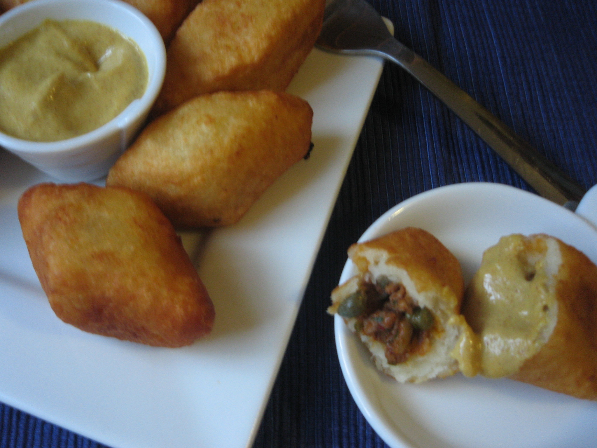 My ladies-who-make-lunch party didn’t didn’t go any smoother.  I had planned to to have everything under way but was running late, so when she got there (also late), I had only just started boiling the yuca.  I thought it would take a few minutes to mash the yuca, but we’d let the it cool too much (probably talking) so that it hardened and took much longer to push through the food mill.  The picadillo was quick by we bickered over how to form the fritters – Val thought I was being too stingy with the filling (which I was) and I thought she was being too messy (which she was).  In between squabbles, requests for Val to scold my dogs in Mandarin which she speaks fluently, and endless cranks of the food mill, the sun was sinking and late lunch was becoming early dinner.