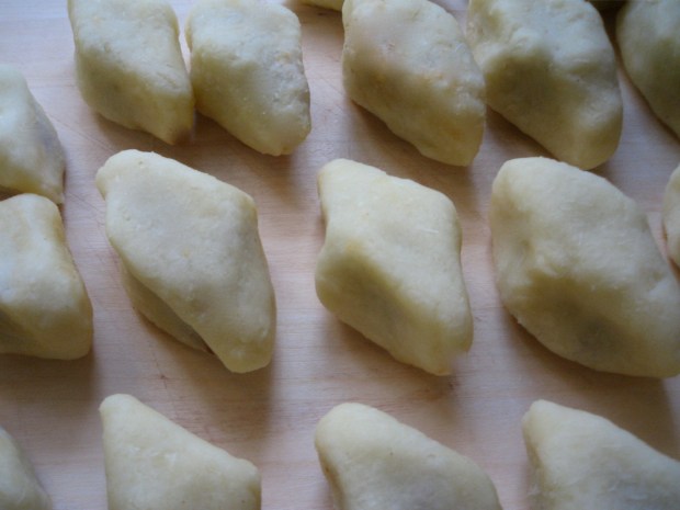 Divide yuca dough into 20-25 individual pieces rolled into 1 1/2-2″ balls.  Create a well in the center of each ball and fill with one tablespoon of picadillo.  To form the carimañolas, gently push the filling into the center as you close dough around it forming a diamond shaped fritter.  Repeat with the remaining dough balls.