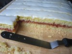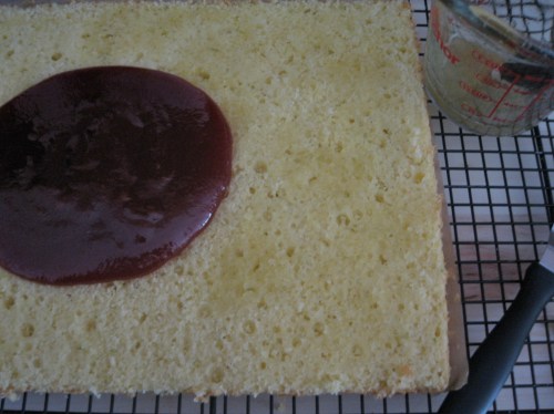 Using a long serrated knife, slice cake in half horizontally.  Set aside top layer.  Lightly brush bottom layer, cut side-up with lemon syrup.  (Use syrup sparsely, no more than 2 tablespoons).  Cover cake with cooled guava preserves and top with remaining layer, cut-side down.