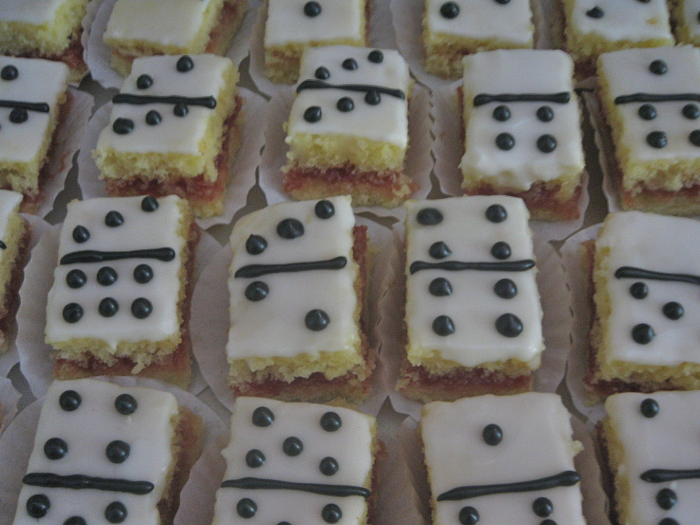 After that, I couldn’t resist going for a whole set of double-6, this time petits fours with guava filling and a lime glaze.  Set on frilly cupcake liners they can glide across the table for a quick game.  I wouldn’t suggest rapping them twice to skip a turn, flicking them across to your partner to set down for you, or slamming them on the table when you have “domino!”, but whatever tiles your left with, you can eat.  My dominoes, my rules.