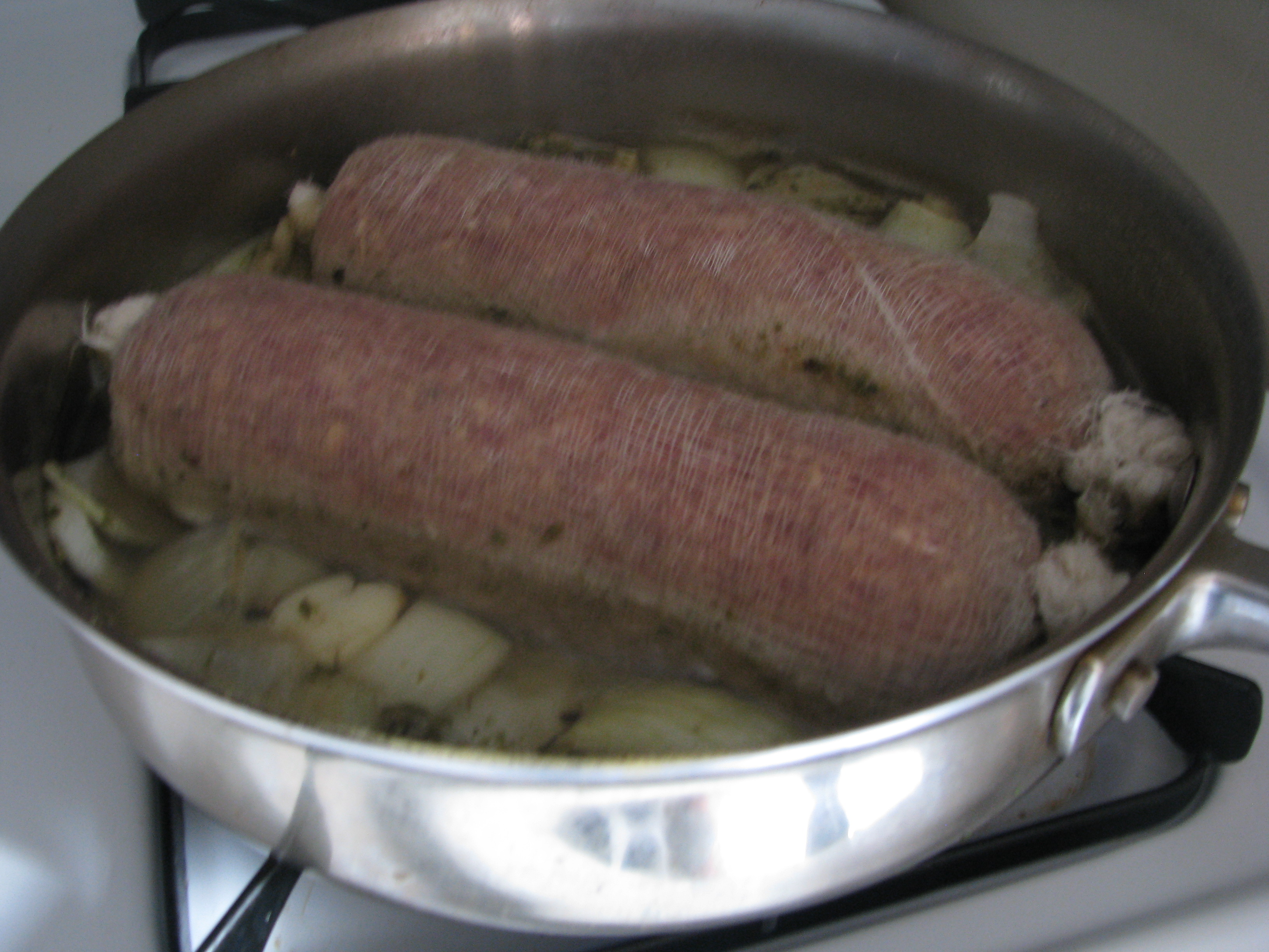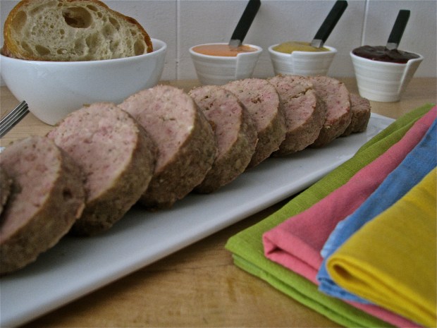 Add the ingredients for the broth to a large saute pan or heavy pot with two cups of water and bring to a boil.  Add the wrapped rolls and lower heat to a low-simmer.  Simmer for two hours until cooked through, checking frequently.  Add hot water to pan if necessary so that the rolls are surrounded by about 1 1/2 inches of water as they cook.  Remove from the broth.  While still warm, remove the cloth.  Allow to cool to room temperature then refrigerate until cold.  Slice and serve with desired toppings and crackers or slices of toasted baguette.