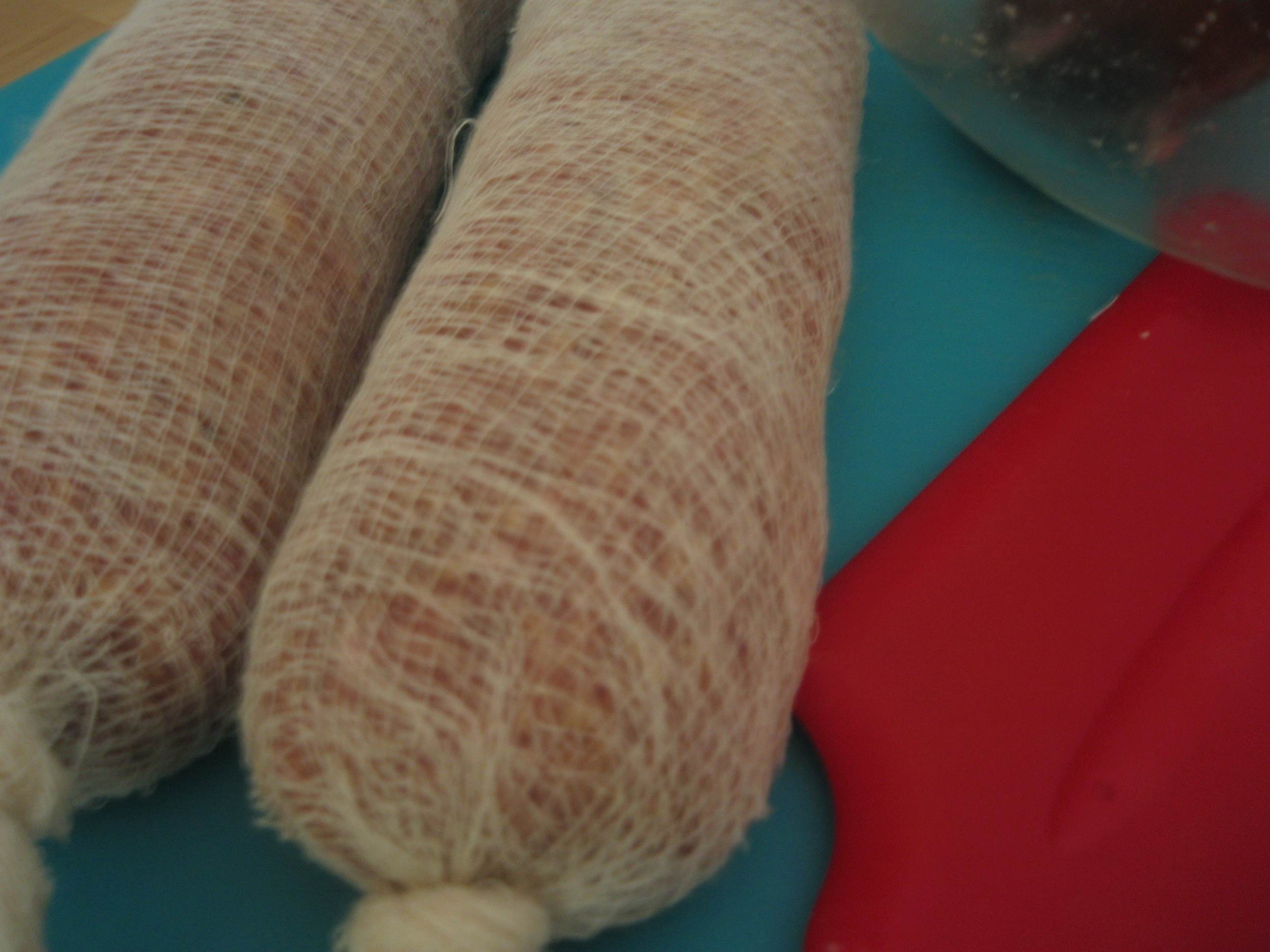 Divide the mixture into quarters and shape into individual rolls.  (See note here if baking.) Tightly double or triple wrap each roll separately in cheesecloth like a sausage.  Securely knot both ends so that none of the mixture will leak out (no sewing required).