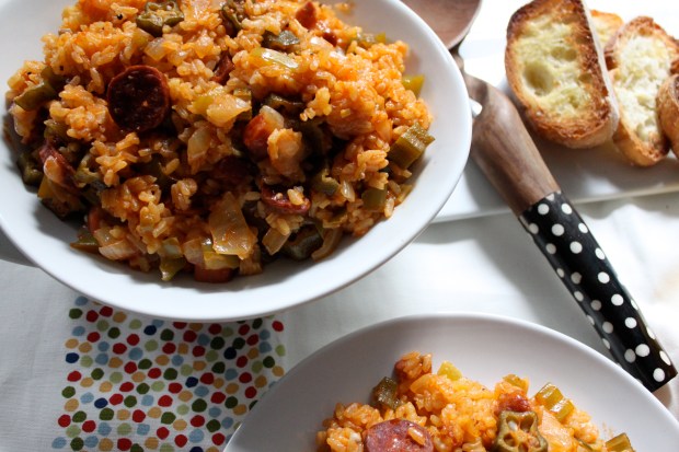 While the okra soaked in cold water, I prepped the onions, peppers and garlic for the sofrito, surprised at how much I missed the chopping and dicing. Trying to do as much as possible beforehand so that the timing would be right when I added the rice. Once it was all simmering, I stepped away for a few minutes while the ingredients sorted themselves out. In a half hour, I had a bowl of bright gold rice, star shaped okra, and red rounds of chorizo that were well worth the heat. Even after a needed vacation, it’s good to be home.