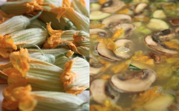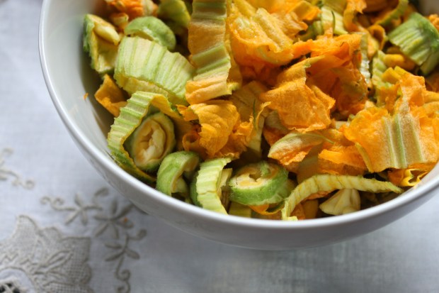 I don’t usually let myself buy flowers.  Frivolous in a million other ways, I become oddly practical when it comes to that.  I’ll consider the enormous sunflowers bursting out of their buckets but head straight to the potted basil, lavender, and rosemary plants instead, preferring the kind of pretty you can eat.  That’s why I get so excited when squash blossoms arrive at the markets.  Since July, I’ve had them stuffed, fried, chopped and sauteed with tomatoes.  Now that the summer is melting away and every day feels like Sunday night, each bag of blossoms has become that much more precious – shriveled and golden, bugs and all.