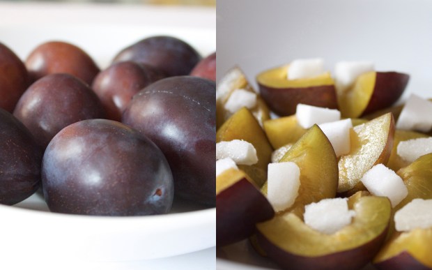 4 red or purple plums, pitted and quartered or 16 small Italian prune plums