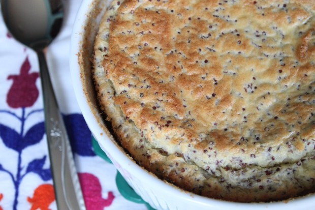Originally cultivated in the Andes approximately 5,000 years ago, quinoa is actually a seed in grains’ clothing. A staple crop for the Incas, their rulers ceremoniously planted the first row with golden implements at the start of each growing season. Packed with protein, fiber and amino acids, it’s a nearly complete food. Quinoa can be buff or black but I thought red, sometimes sold as “Inca Red”, would be a nice contrast. With all the time in the world and some unexpected practice, I wasn’t as apprehensive. I’m not sure if noise really brings down a soufflé but I can attest that this one survived a double-Yorkie barking attack. While not creamy like the amaranth, it retained just enough snap from the quinoa to keep it interesting. Third time is the charm.