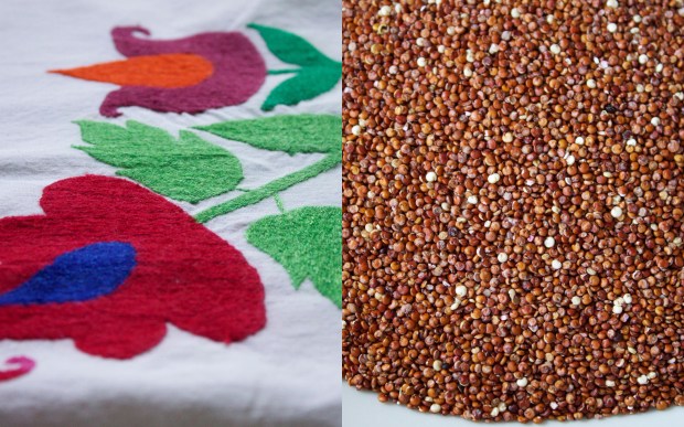 I used the last of the Roncal for the base and whipped up the egg whites to beak-of the-bird perfection. I set it in the oven and congratulated myself on having an early night before a long run. Then I realized that my whites may have been perfect but I’d forgotten to fold them before putting it the mold into the oven. The egg yolks and cheese base just sat there, unsure of what to do next. It was too late for my soufflé but I had some cooked amaranth left and just enough Gruyere to make another one. My early night gone, I rushed. Folding in my next batch of less than perfect egg whites, it still puffed up as hoped and I finally had my (now late) dinner. Loving the way the tiny grains disappeared into the eggs like polenta, I was excited to try it again with quinoa.