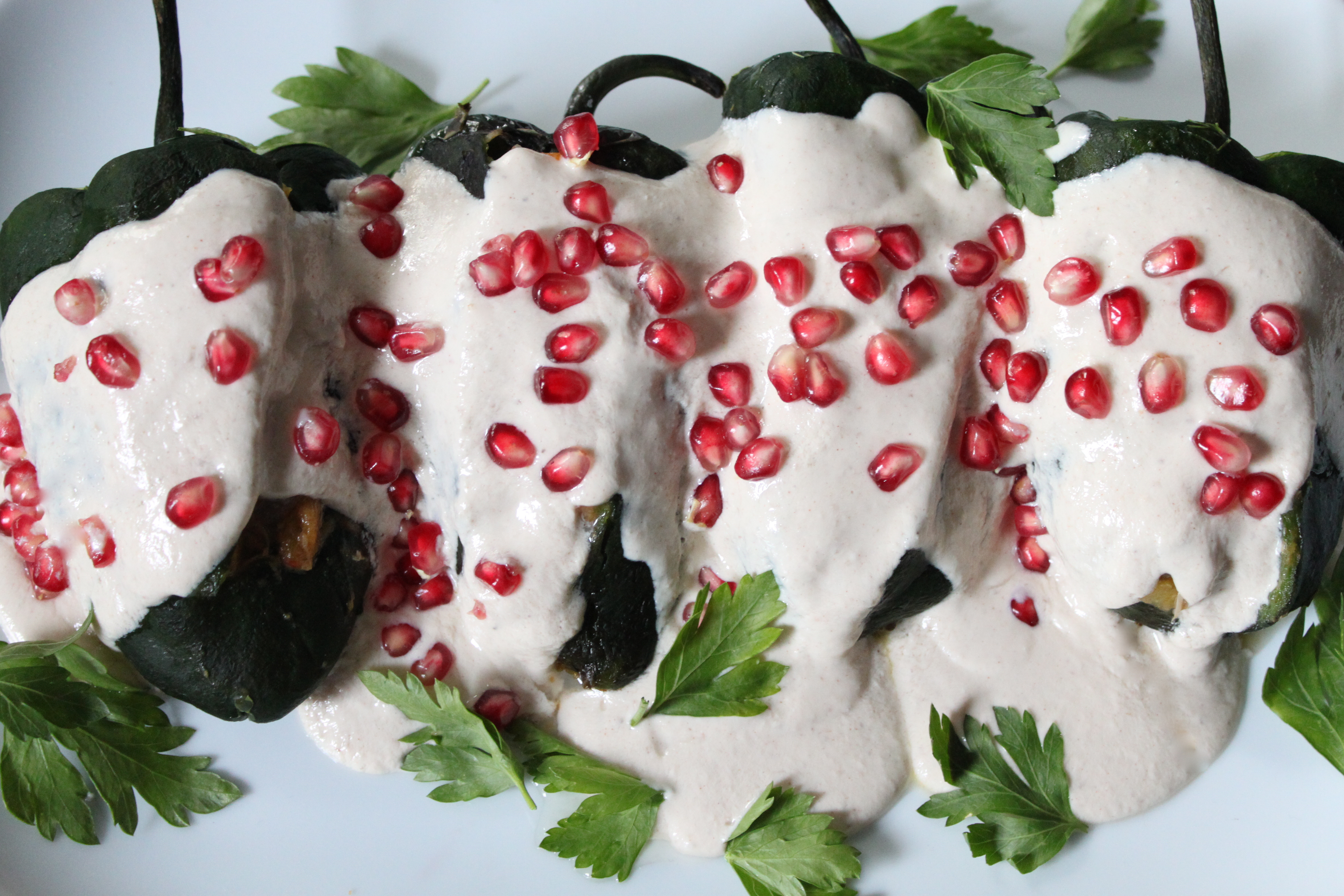 I saw a reference describing end of summer/start of fall cooking as “valedictory meals”. I prefer to think of this time as a cross-fade. As one season quiets down, another one starts to roar, but for at least a moment they make the same sound. To take advantage of the markets in transition, I made an Argentinian Carbonada Criolla, a heavy beef stew lightened with peaches, pears and corn served in a pumpkin last September. This year I decided to try Mexico’s chiles en nogada. Pork or beef picadillo stuffed into poblano chiles, it’s covered in a chilled, creamy walnut sauce and garnished with pomegranate seeds.