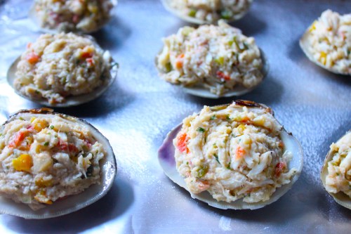 Using an ice-cream scoop to measure out equal portions, scoop the crab mixture into the shells and press it down so it fits into the shape of the shell. Repeat until all the filling is used. Spread a thin coat of crust onto the filling.