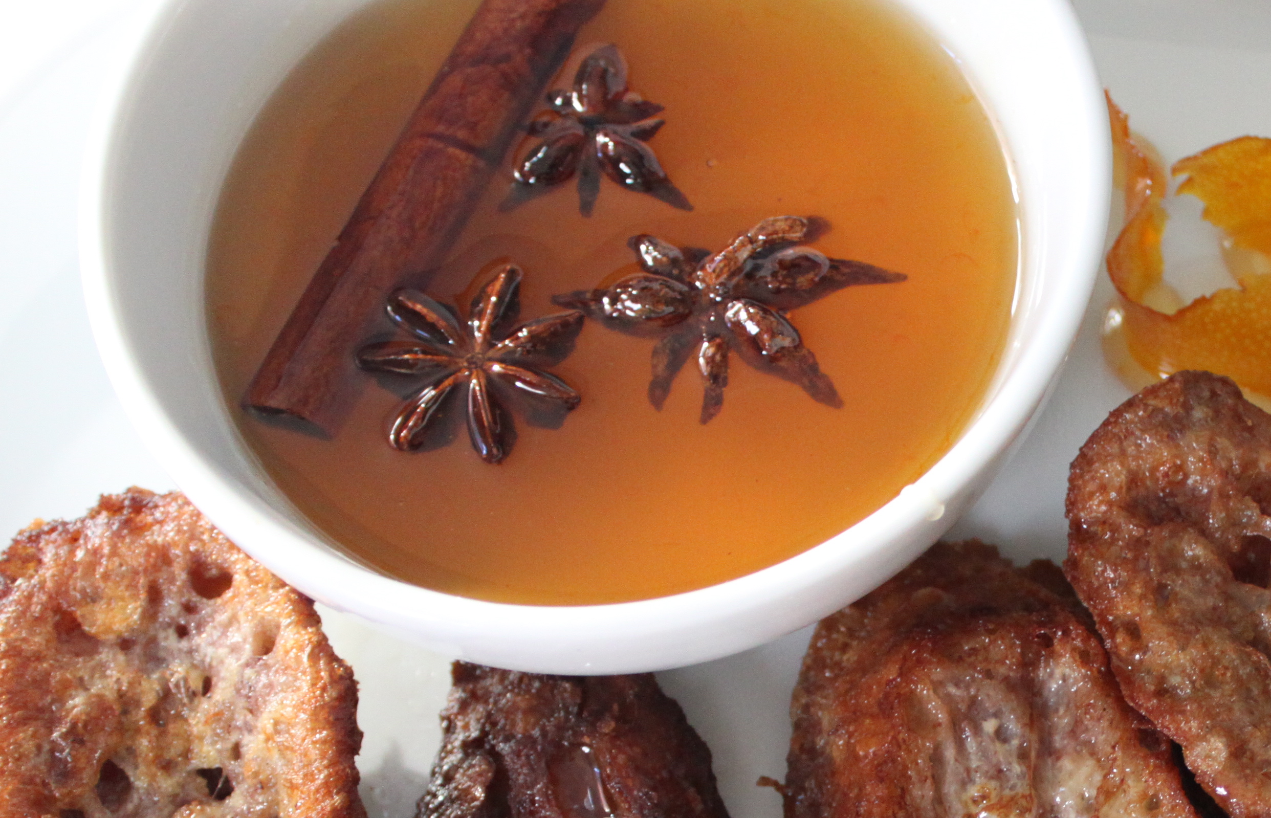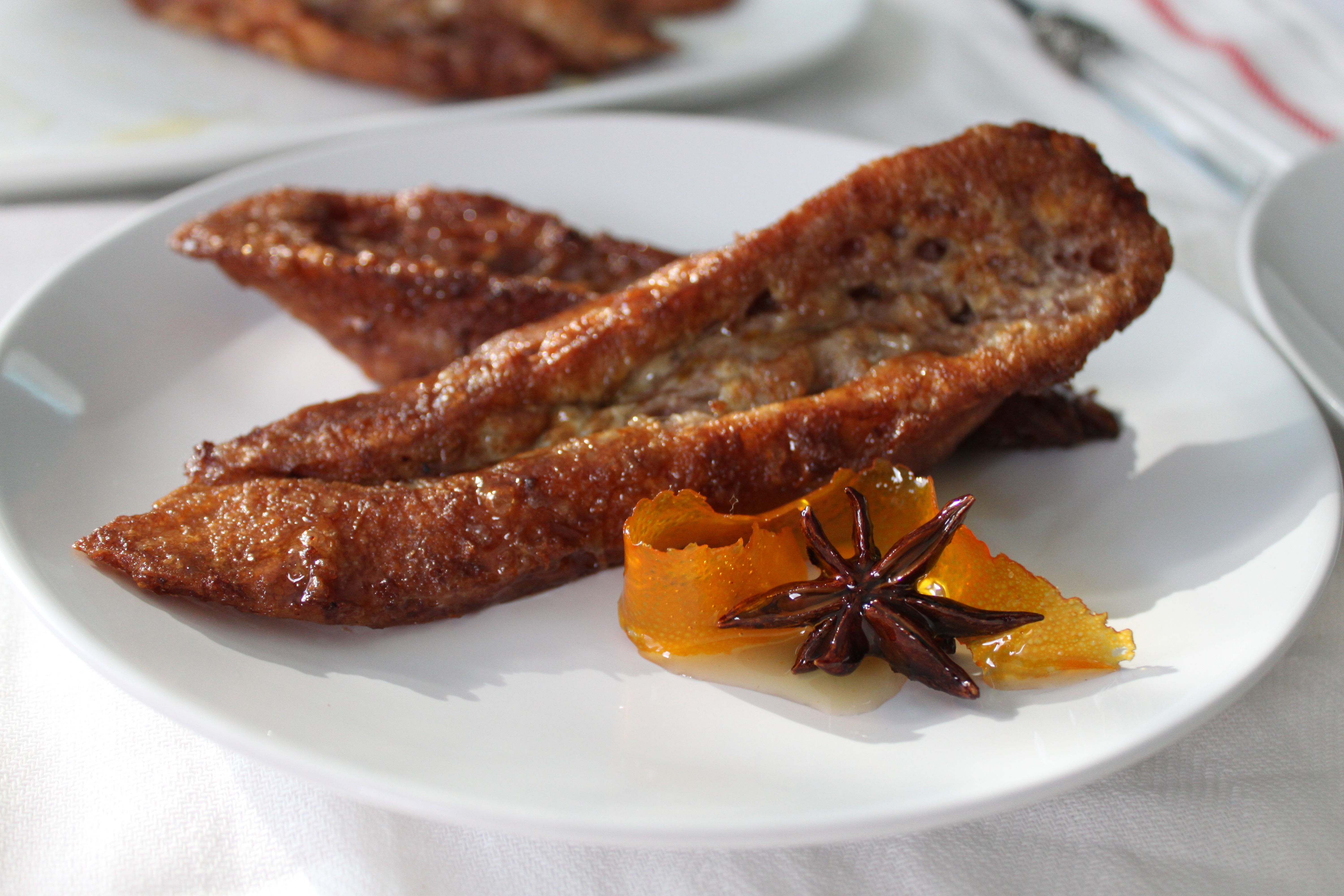 With so many variations, I wasn’t sure which way to go. Most recipes called for equal parts milk and wine or even just red wine. My sweet side won out so I soaked the bread with milk boiled with a little sugar and cinnamon before drizzling it with wine. While the bread soaked, I thought they would never hold together for the final egg dip but they did. Lightly fried, they crisped up quickly while remaining moist throughout, taking up the orange-anise syrup without becoming soggy or overly sweet. I was happy I’d chosen a good Italian wine that I’d been saving. At first, pouring it over bread to be fried seemed wasteful but for once I didn’t care. I love eating wine and being back in the kitchen and finally making torrijas became it’s own special occasion.