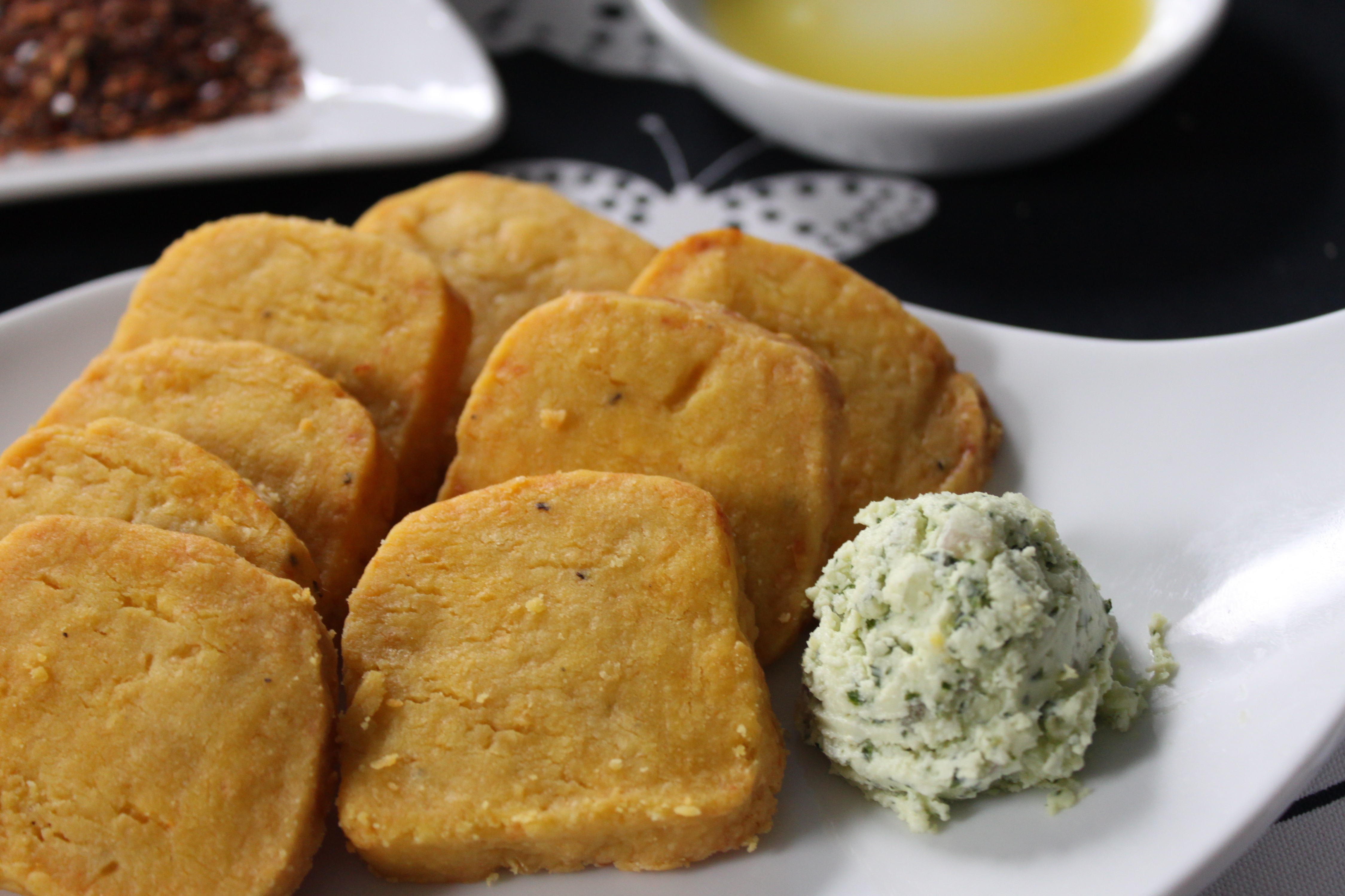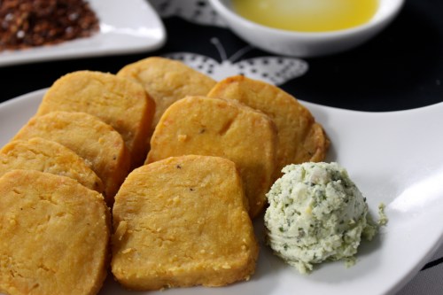 In an electric mixer fitten with the paddle attachment, beat the butter at medium-high speed until it is pale and fluffy, about 2-3 minutes. Blend in the ají amarillo paste and continue to beat until just combined, occasionally scraping down the sides, about 1-2 minutes. Combine flour, parmesan, salt and pepper. Using a wooden spoon or spatula, stir in the flour mixture for a couple of turns. Return to stand and mix on low speed until flour is just incorporated. Pour onto a piece of plastic wrap and shape into a log. Chill until firm at least 1 hour or overnight.