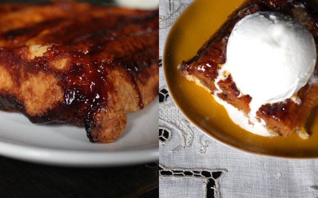 One of my favorite recipes – breakfast, lunch or dinner – is platanos en tentación. If I didn’t already love the ripe plantains sprinkled with sugar, cinnamon and vino seco then baked until it’s brown and bubbling, I’d love it for the name alone. Despite being all sweetness and caramel, we’d always have it as a side dish, a technicality that fooled no one. I love tarte tatin and with apples going the way of snow boots and puffy coats, ripe plantains seemed like the perfect alternative. Just like the apples in the tatin, even the burned bits of plantain are kind of great. In addition to the sugars, cinnamon and melted butter, I added dark rum – a little added temptation before the austerity of lent sets in.
