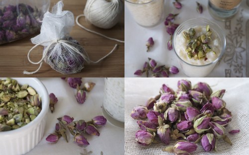 I love adding rosewater to desserts but I’m always wary – too little and it’ll be overpowered, too much and it will taste like perfume. I made a bouquet garni (favorite new cooking term) from dried rosebuds and added it to the rice and water while it boiled then removed it before adding milk, sugar and lemon zest. Though I didn’t realize at the time, rose pudding is actually a Persian dessert called sheer berenj, seasoned with cardamon and chopped pistachios, so I set those out as well.