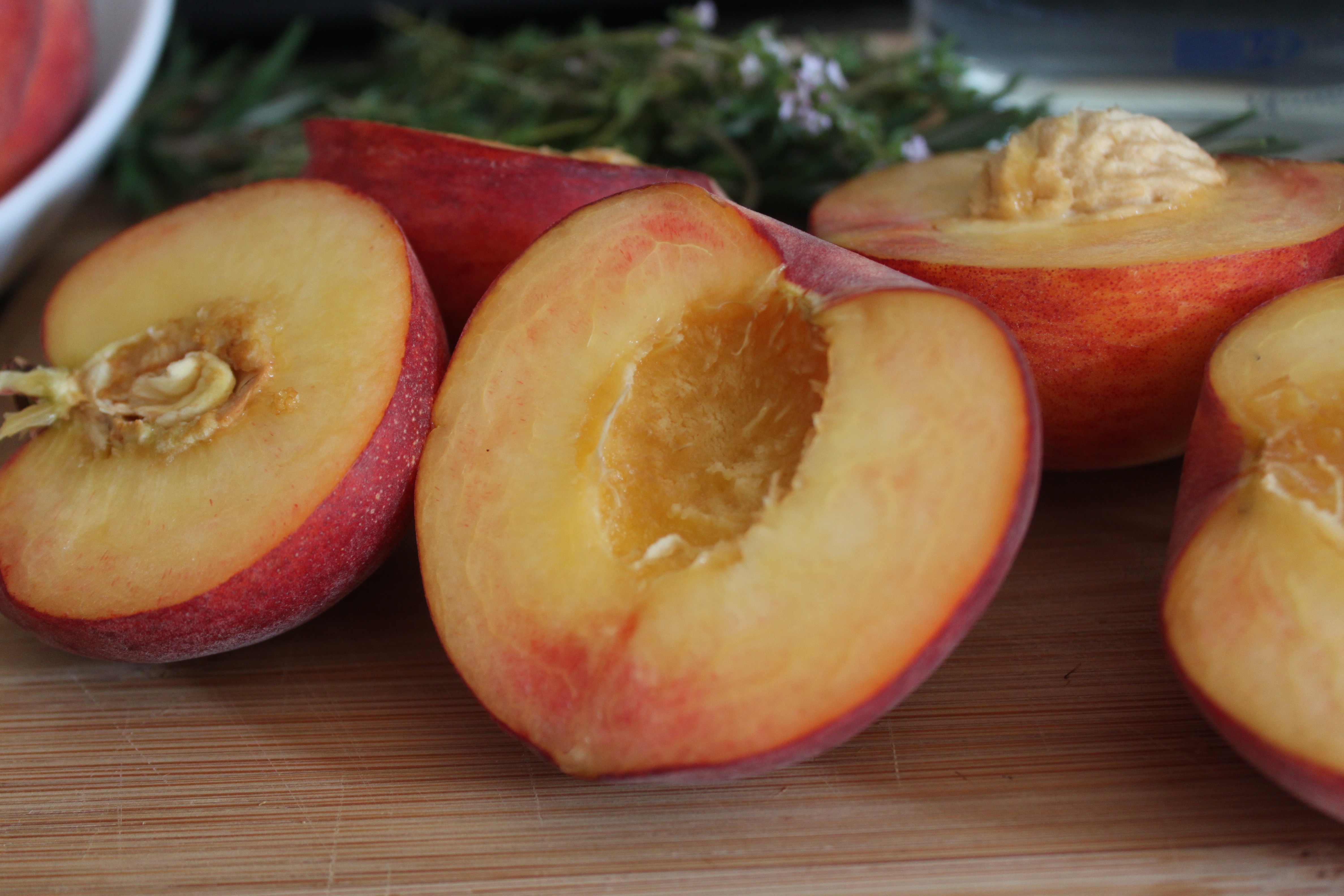 Combine sugar and 2 cups of water in a wide-bottomed saucepan. Over medium heat, stir until the sugar has dissolved and bring to a simmer. Add peach halves, rosemary and thyme. Keep at a gentle simmer until tender, turning once, about 3 minutes on each side.