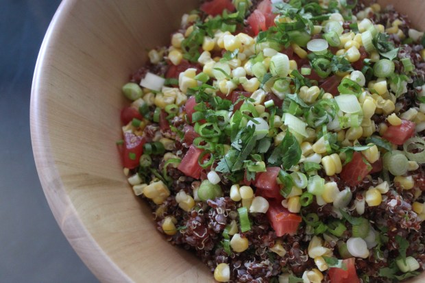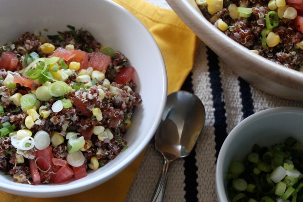 Covering an expanse form the Mexican frontier to Patagonia, the book cuts through the wood and smoke to present a regional grilling menus, making distinctions between countries and food cultures so you understand the similarities and differences between an Argentinian Asado, Nicaraguan Ranch Roast, and Brazilian Rodizio. A cooking teacher both at NYU and the Culinary Academy at the Biltmore Hotel in Coral Gables, Castro explains not just the hows but the whys.  While I can’t wait to try the bacon wrapped scallops, suflé de yuca, or lomo al trapo, it was the quinoa salad from the Peruvian Grill section that first caught my eye – nutty quinoa with a slight snap tossed with corn, green onions and tomatoes then lightly dressed with lime juice and olive oil. I have no plans to host my own cookout this year, but I always try to be a good guest and this one stood out as a make-ahead, take-along recipe – not that it made it to a friend’s house. With the temperatures boiling, it’s been my go to cold lunch all week. Most importanly, it allowed me to hit up the farm stands and load up on the summer produce I love knowing exactly what I was going to make of it all. Grilled Corn and Quinoa Salad