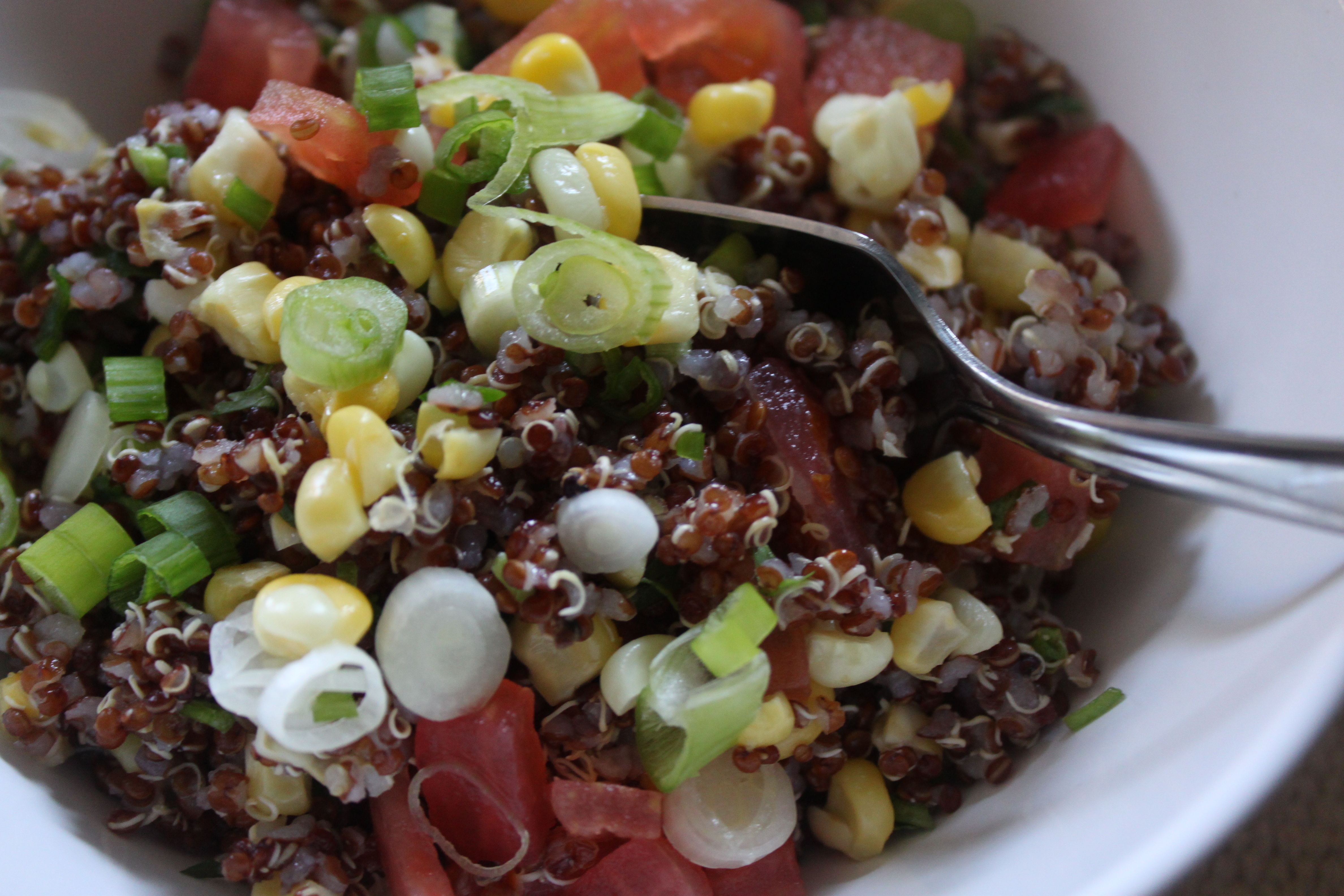 TOSS AND DRESS THE SALAD AND SERVE Cut the corn kernels off the cobs, slice the grilled green onions, and add both to the quinoa. Toss in the tomatoes and cilantro and mix well. Drizzle the lime juice and olive oil over the salad and season with salt and pepper to taste. Toss well before serving.