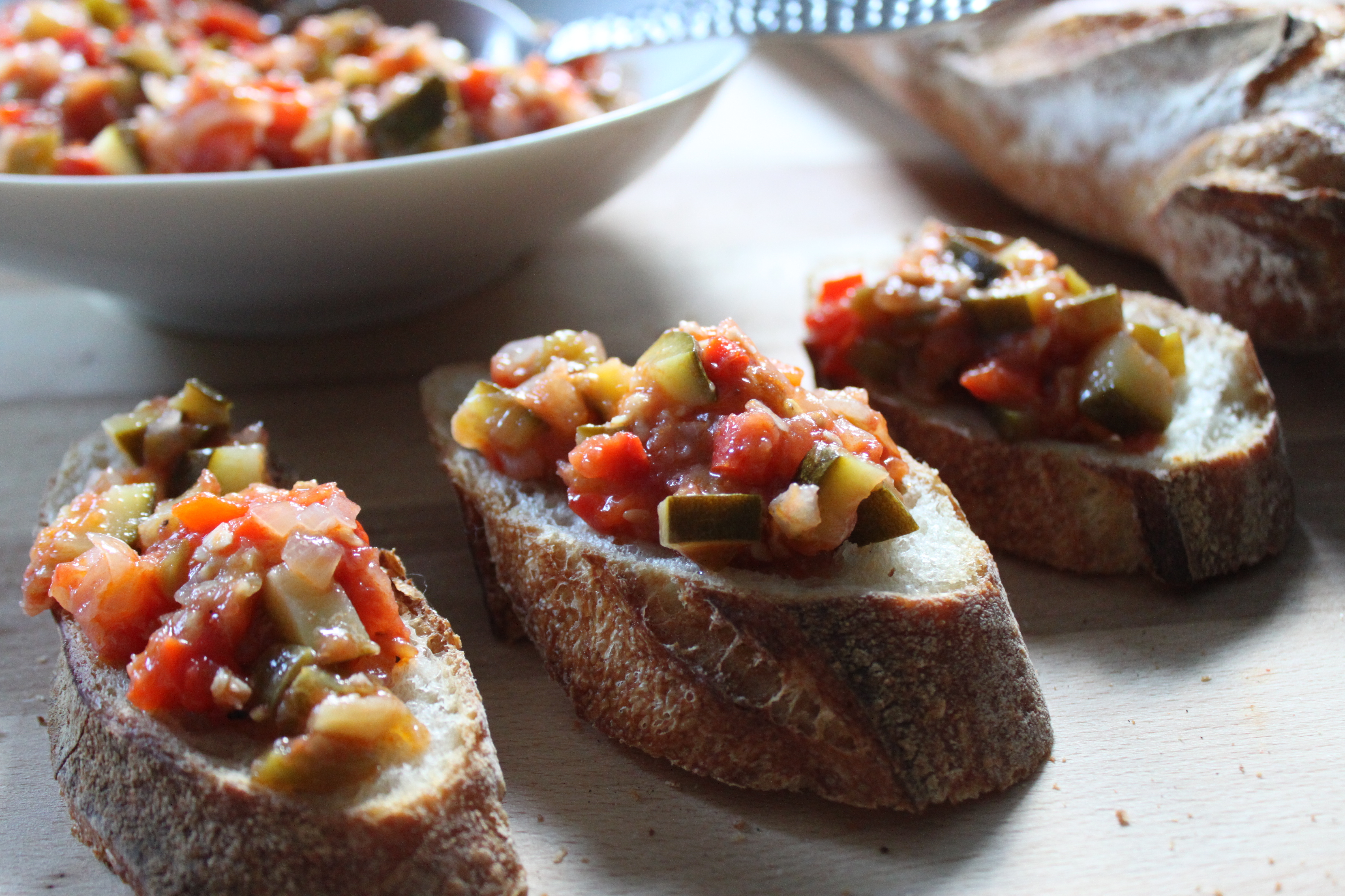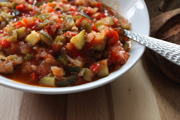 In a large, deep sillet, heat the oil over medium heat. Add the onions and sautee until they begin to soften, adjusting the heat so that they don’t brown, about 7 minutes. Add the diced peppers and zucchini and continue to sautee until the vegetable soften, about 10 minutes. Stir in the garlic and continue to cook about one minute. Add the tomatoes. Cover the pan and lower heat to a steady, slow simmer. If the pan dries out, add one tablespoon of water and continue to cook until the vegetables are tender, about 35-40 minutes . Stir in red wine vinegar and a pinch of sugar to taste. Season with salt and freshly ground pepper.