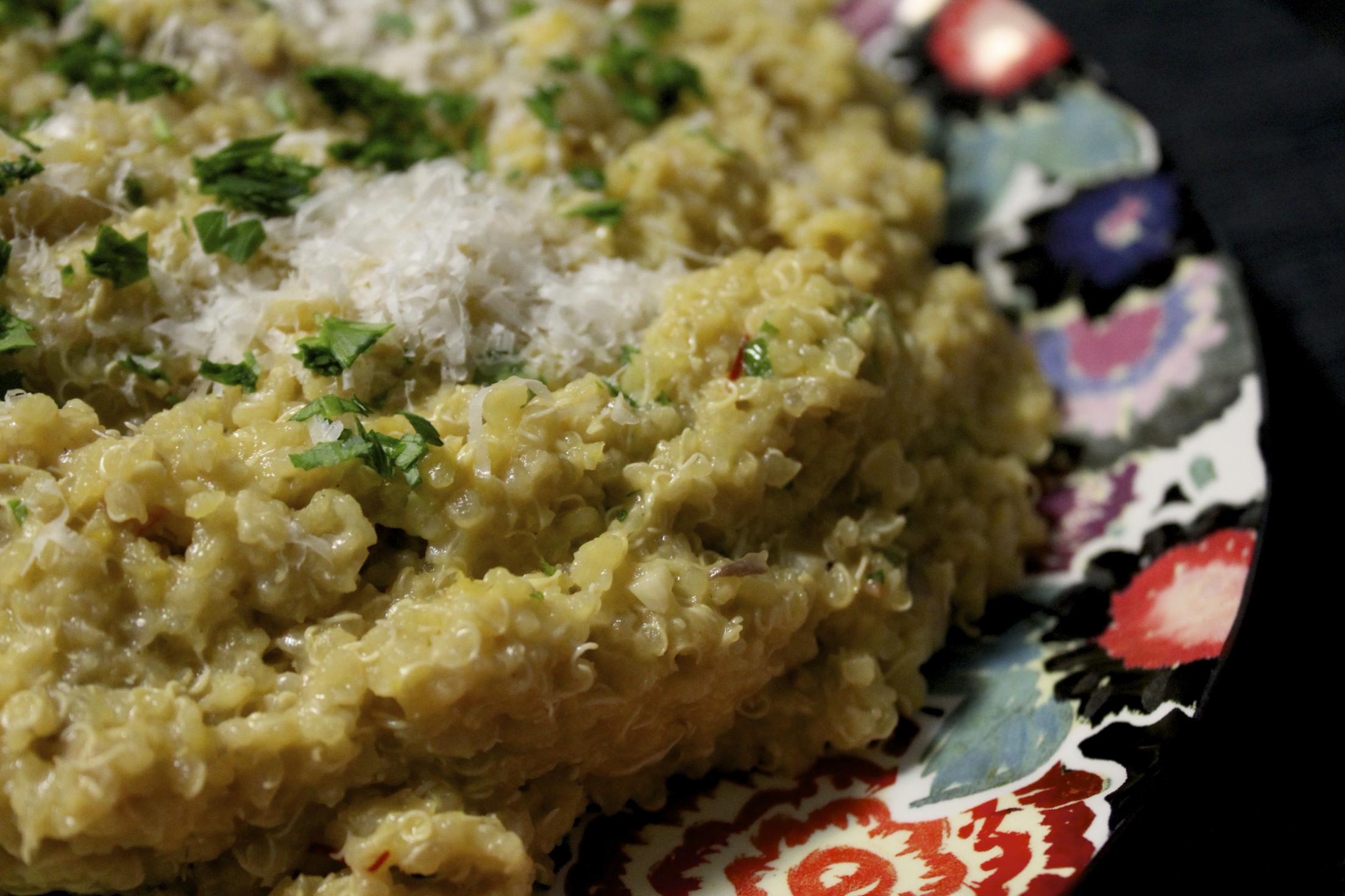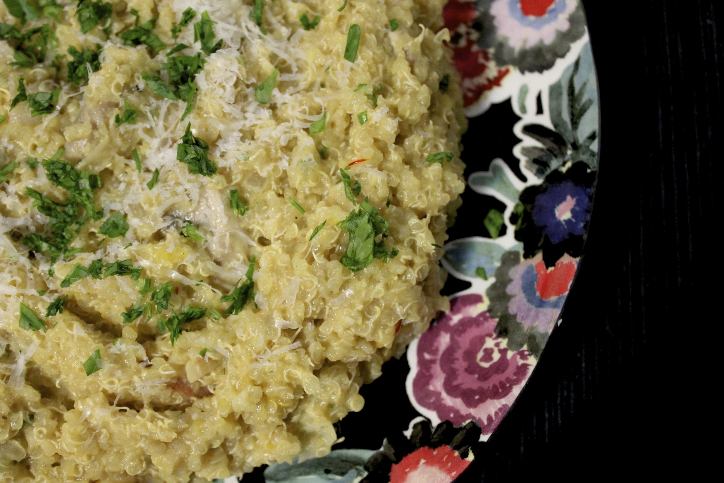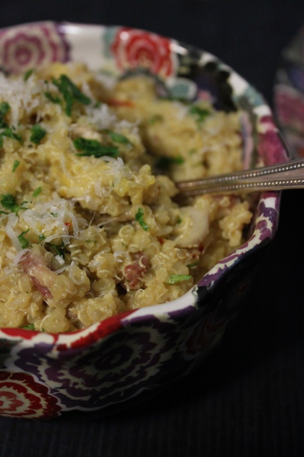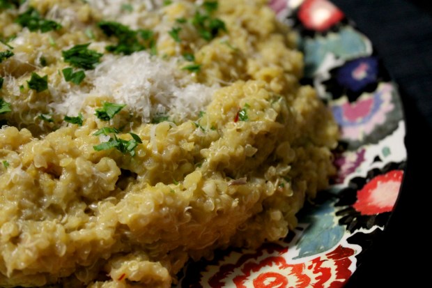 *The original recipe recommends draining the quinoa. I prefer a looser risotto so I let the quinoa cool in the broth and combined it with