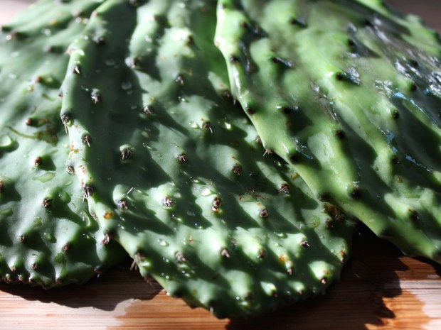 I’ve always been a little afraid of cactus plants. Though inclined to like any vegetation that looks like an alien life form, the very idea of a cactus sends tiny invisible splinters to my fingers. In reality, it’s the cactus that should fear me, since I managed to kill one in college with the reasoning that if it could just survive in the dessert, it would flourish with regular watering. It did not.  While I’d vaguely heard of cactus salad and stuffed nopales, I didn’t grow up in the southwest and it wasn’t till visiting Mexico last year, where they were piled high in the markets, that I really thought of them as an everyday vegetable to try.  Assuming I would have to wait for my next trip or plan a weekend excursion to Brooklyn’s Sunset Park, I was at Essex Market on the Lower East Side when I saw them in a produce case – firm, bright, and as perfectly ordinary as a pile of green beans.  I brought them home.