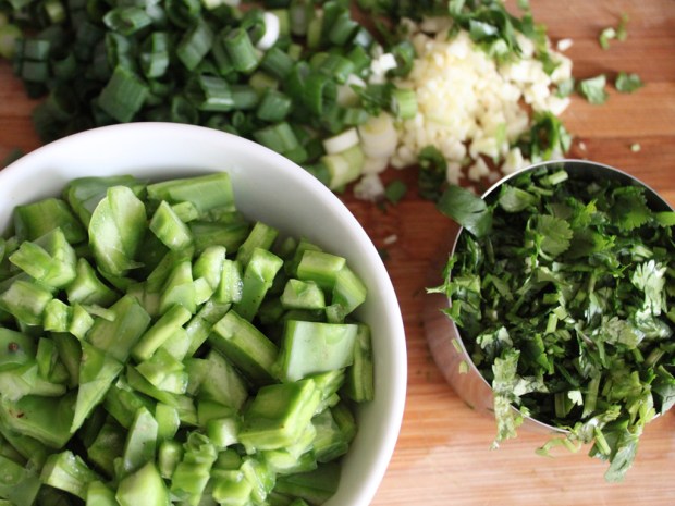 1 heaping cup of nopales (also known as prickly pear cactus or cactus paddles), diced